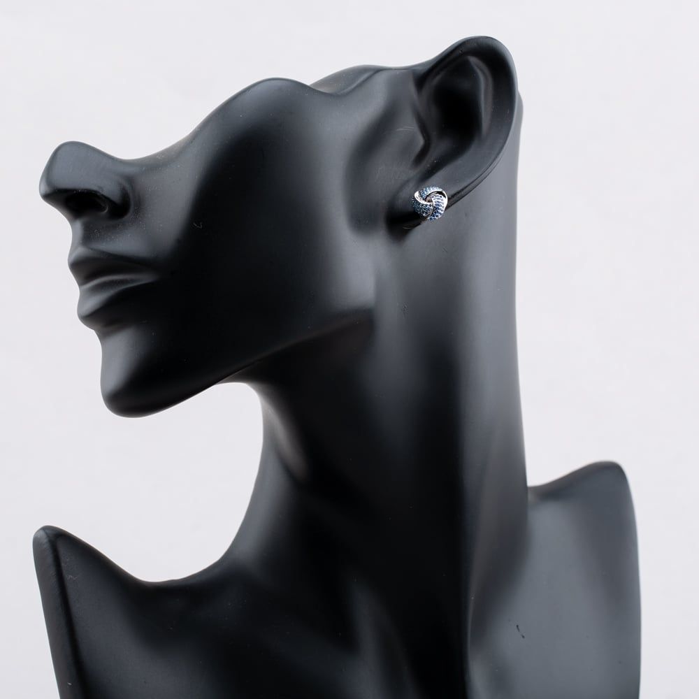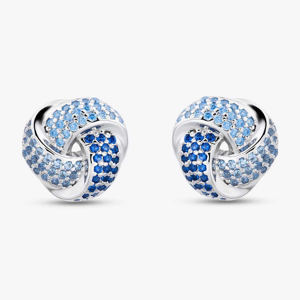 Crafted from high-quality sterling silver, these studs boast a brilliant shine thanks to their rhodium plating. This precious metal coating not only enhances their lustre but also provides excellent protection against tarnish and scratches, ensuring lasting beauty. The captivating knot design is entirely covered in dazzling, individually set blue cubic zirconia stones. The intricate pave setting ensures maximum brilliance, creating a continuous surface of vibrant blue sparkle that beautifully catches the light.