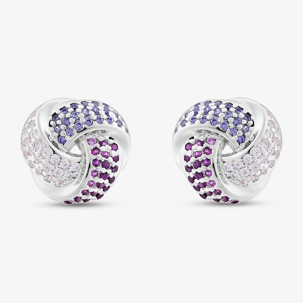 Crafted from high-quality sterling silver, these studs boast a brilliant shine thanks to their rhodium plating. This precious metal coating not only enhances their lustre but also provides excellent protection against tarnish and scratches, ensuring lasting beauty. The captivating knot design is entirely covered in dazzling, individually set pink cubic zirconia stones. The intricate pave setting ensures maximum brilliance, creating a continuous surface of vibrant pink sparkle that beautifully catches the light.