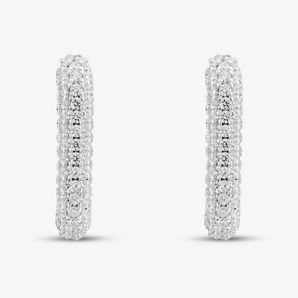 Crafted from fine sterling silver and finished with a rhodium plating, these earrings offer a brilliant shine and lasting resistance to tarnish. Featuring shimmering white cubic zirconia stones set along a sleek creole hoop, this design combines classic elegance with a touch of modern sparkle. Their versatile style makes them perfect for both casual wear and more formal occasions.