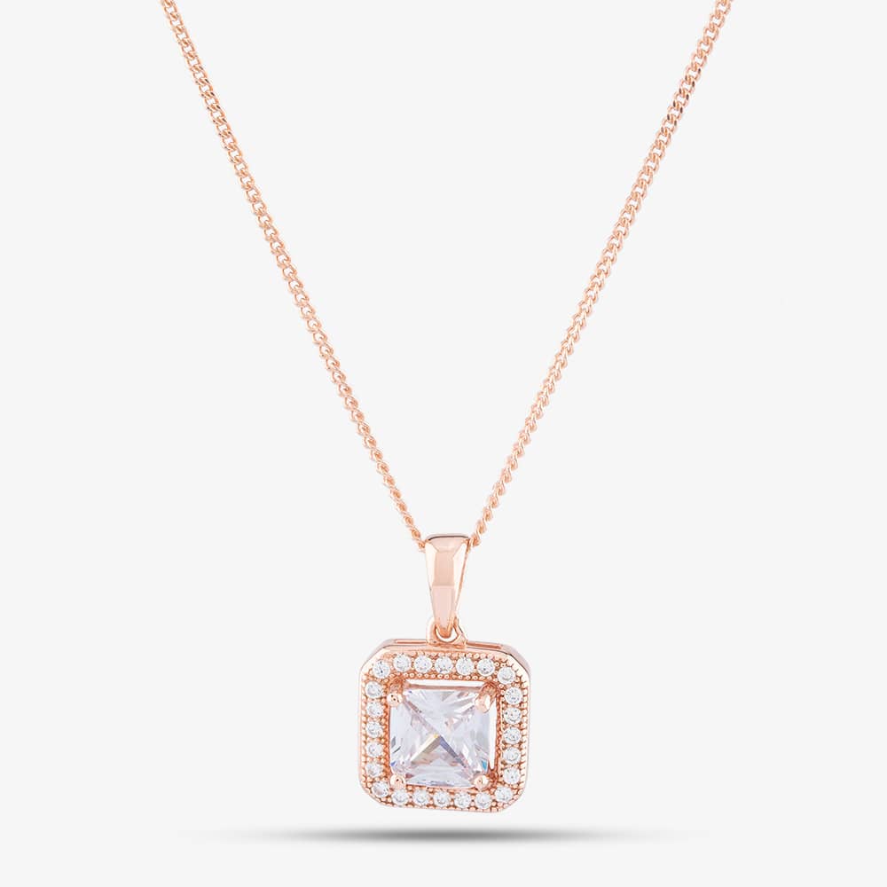 Offering dazzling sparkle and elegant style, the Sterling Silver Rose Gold Crystal Halo Pendant 8.68.4084 is a must have. Made from rose gold plated sterling silver, this 10mm x 17mm square pendant features a 6mm princess-cut centre cubic zirconia crystal framed by a halo of 24 round 1mm cubic zirconia crystals. Pendant is fitted on to the Sterling Silver Rose Gold Panza Curb Chain Necklace 13-13-04N.