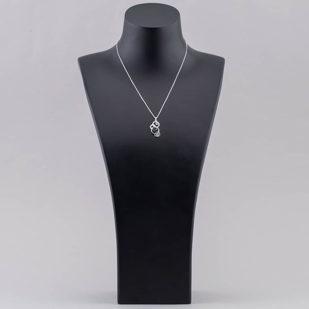 This beautiful pendant is a real statement piece. Featuring an 18 inch Sterling Silver chain with a geometric design pendant. The pendant contains three blue topaz stones set into Sterling Silver and is completed with an anti-tarnish coating.