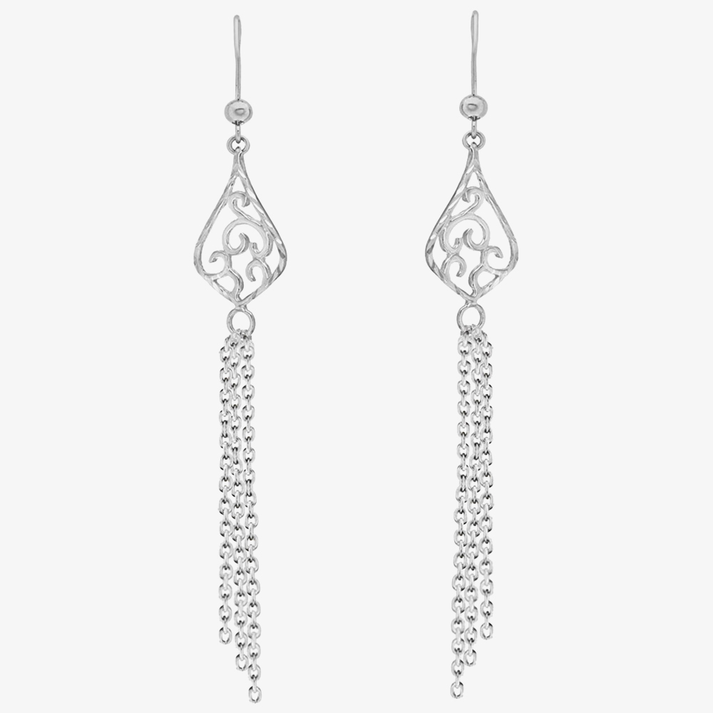 The perfect pair of earrings to add some individuality and elegance to your every day look, the Sterling Silver Tassel Dropper Earrings offer abstract design and beauty to whoever wears them. Made from sterling silver and measuring 10mm x 70mm, these tassel dropper earrings feature a diamond-shaped swirl detail and three trace chain tassels, fastening with a shepherds-hook.