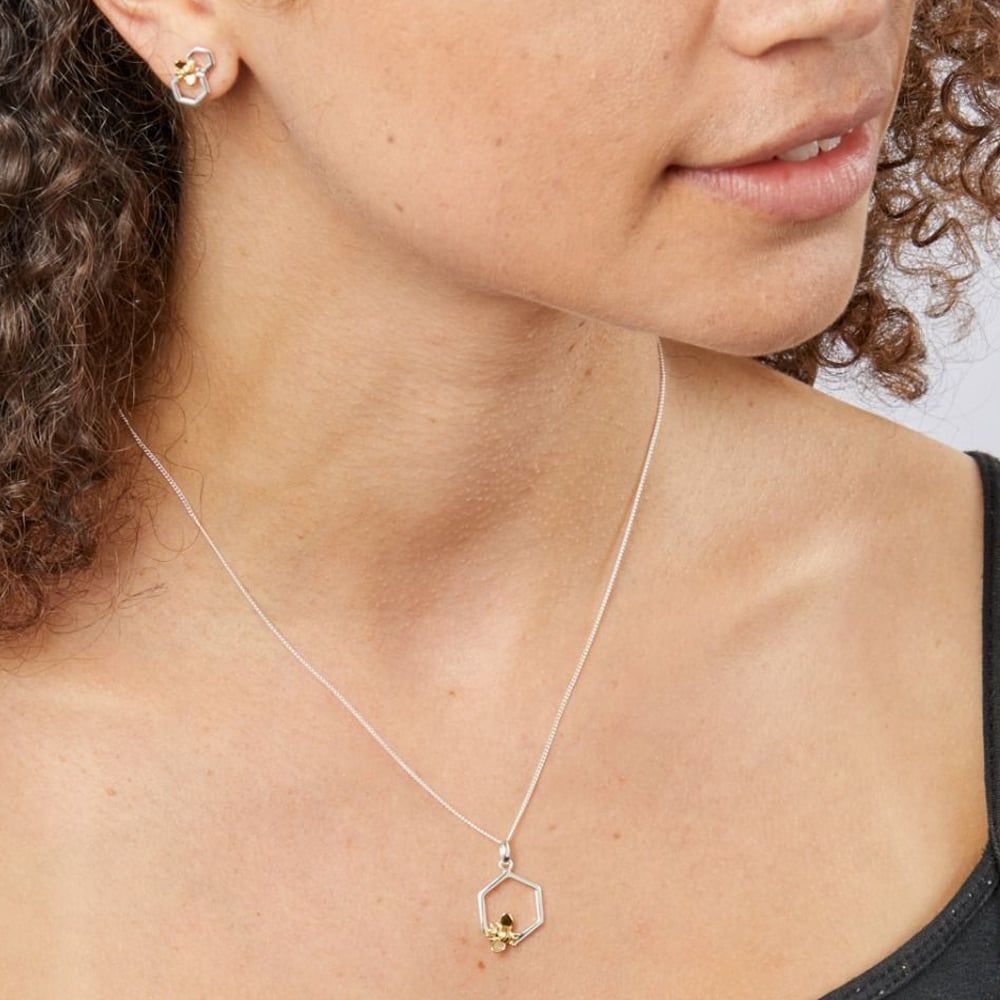 Meet the bee and honeycomb two-tone pendant which features a sweet gold plated bee sat upon a sterling silver open honeycomb hexagon, the pendant is finished with an anti-tarnish coating. Adjustable 41cm - 46cm.