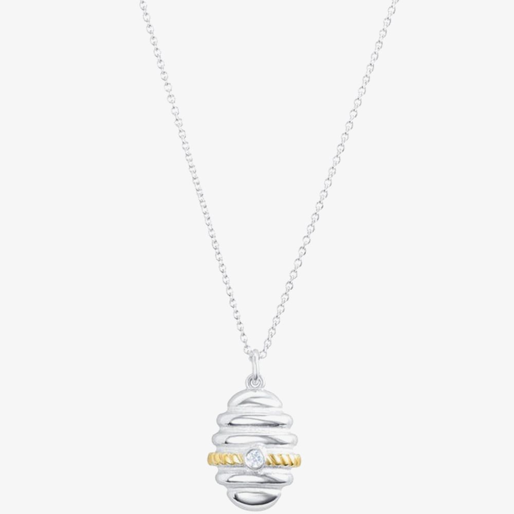 This beautiful necklace features a Sterling Silver bee hive pendant with yellow gold plated detailing and a sparkling cubic zirconia.