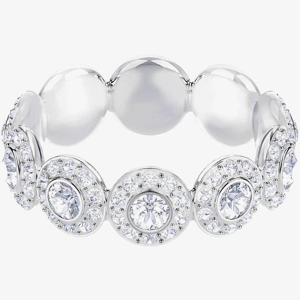 This uniquely designed ladies ring offers a repetitive pattern consisting of a larger sparkling Swarovski crystal surrounded by smaller stones in the centre of a round silver link.