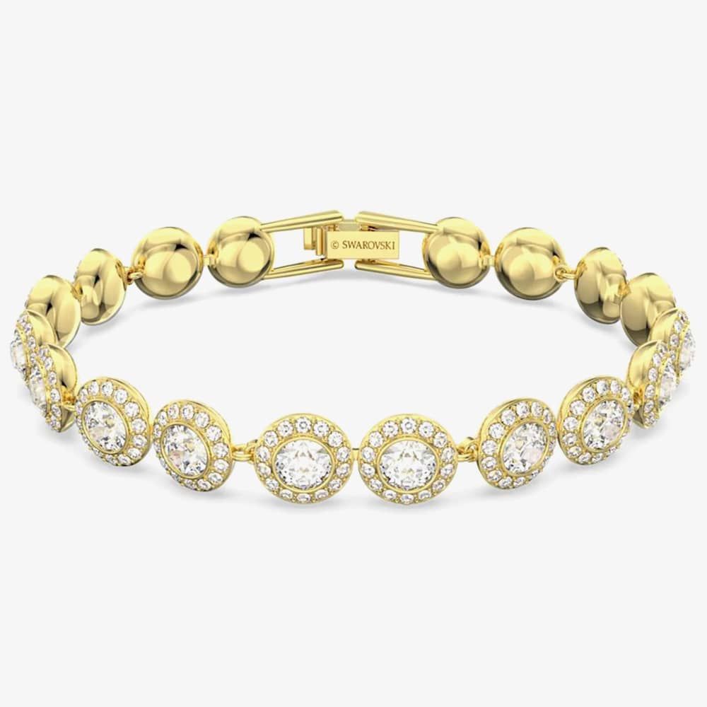 Pure, timeless sophistication. This gold-tone plated bracelet features a row of round clear crystals, each one framed in sparkling clear crystal pavé. Combining perfectly with other pieces from the Angelic family, it would make a gorgeous gift.