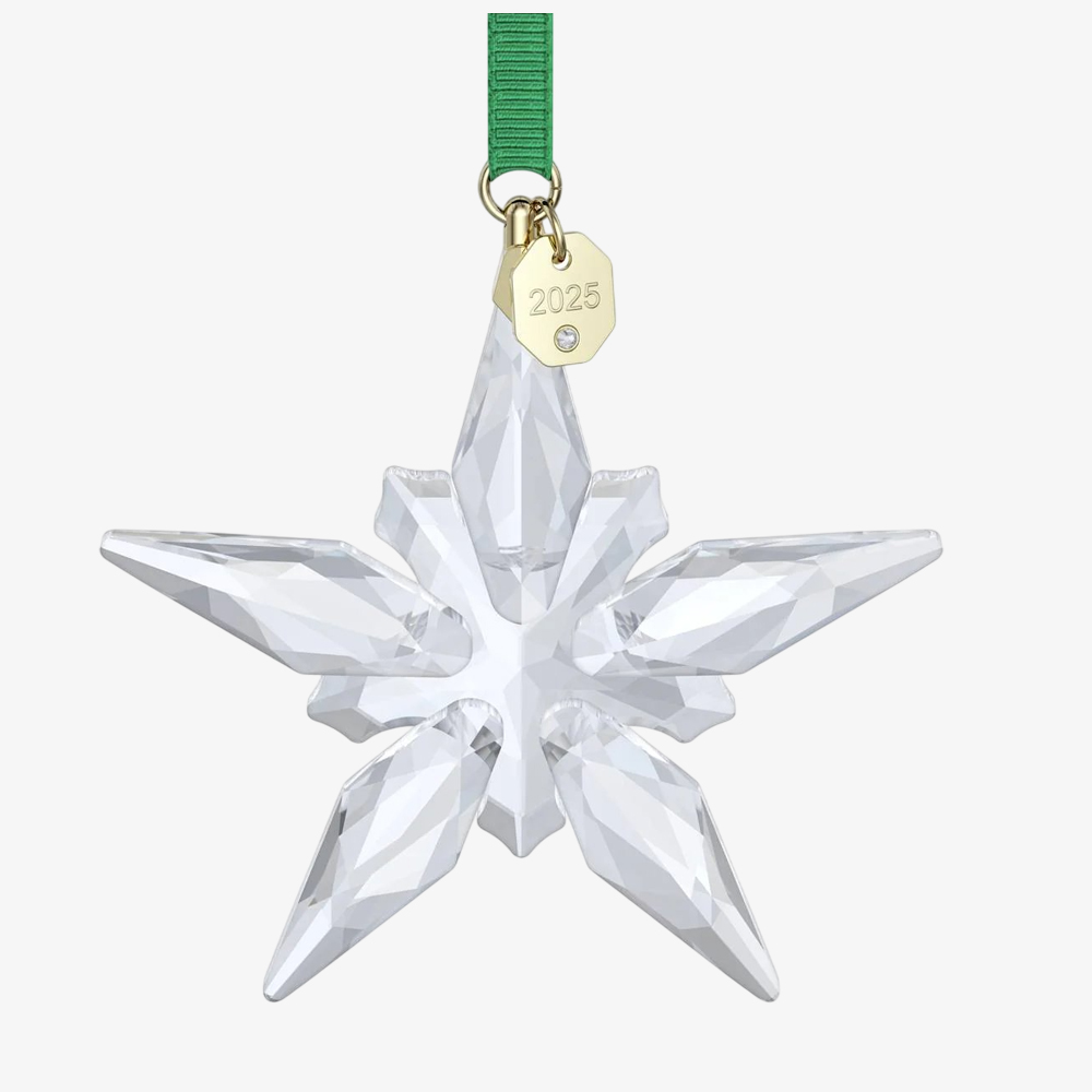 This radiant star-shaped ornament is masterfully crafted from precision-cut crystal, featuring intricate facets that catch and reflect light beautifully, creating a dazzling display. Suspended from a luxurious ribbon and adorned with a sleek metal tag engraved with the year 2025, this ornament is a perfect keepsake to commemorate special memories.