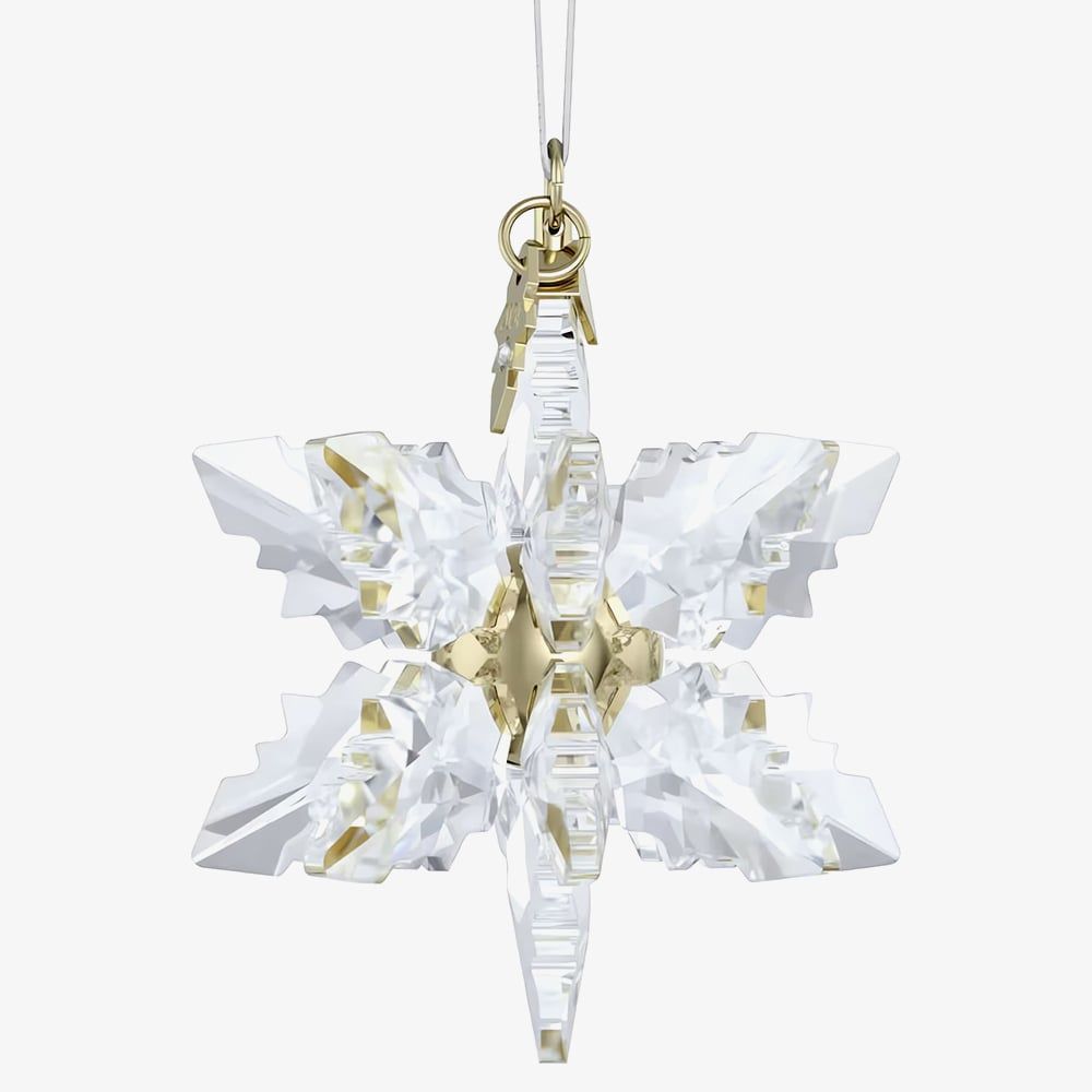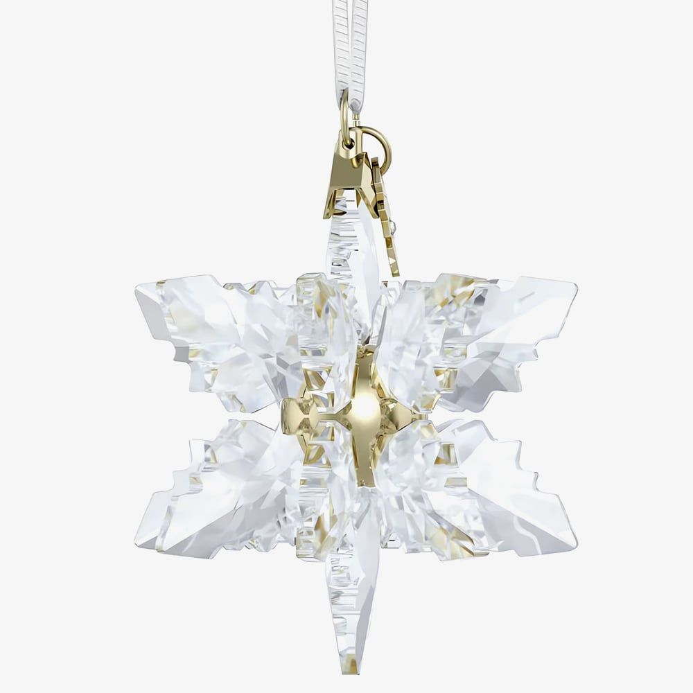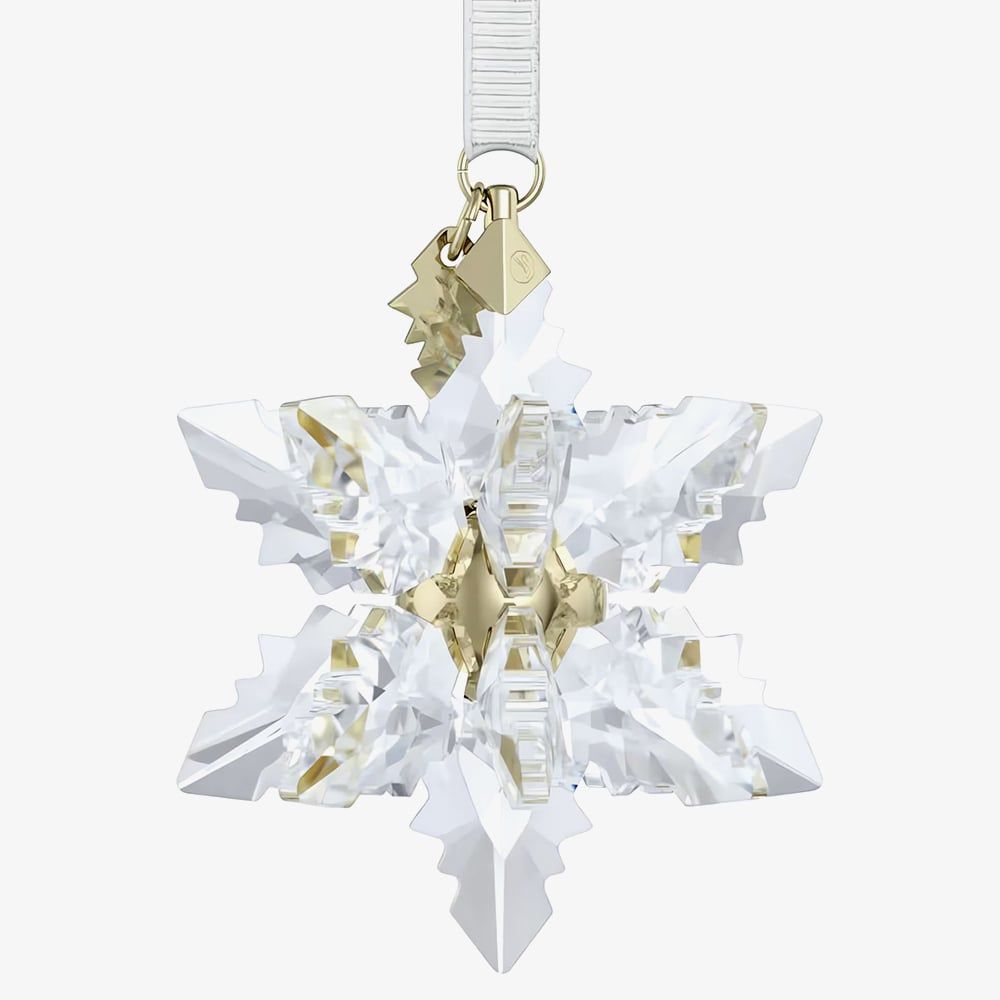 Experience the enchantment of winter with this year’s Swarovski Annual Edition 3D Ornament. Showcasing the exquisite beauty of snowflakes, this clear 3D design exemplifies Swarovski's craftsmanship, featuring 340 facets and 18 distinct peaks. Suspended from a white grosgrain ribbon and adorned with a glossy champagne gold-tone centre, it also bears a tag engraved with “2024.” Perfect for hanging in a window or on your tree, it will illuminate any holiday setting with a magical glow. Note: This is a decorative object, not a toy, and is not suitable for children under 15.