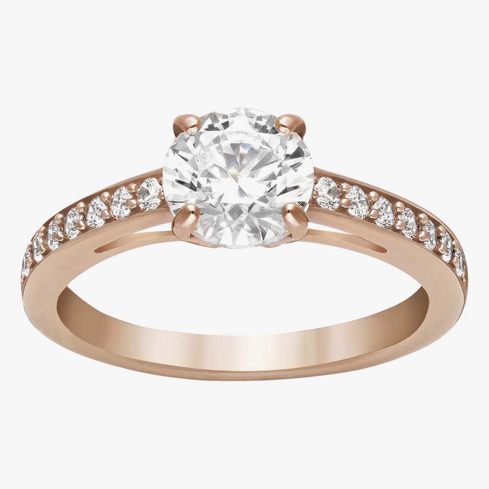 A gorgeous ladies ring that features rose gold tone plated material to form the band. Small Cubic Zirconia are then present in and around the ring leading up to one large glistening stone.
