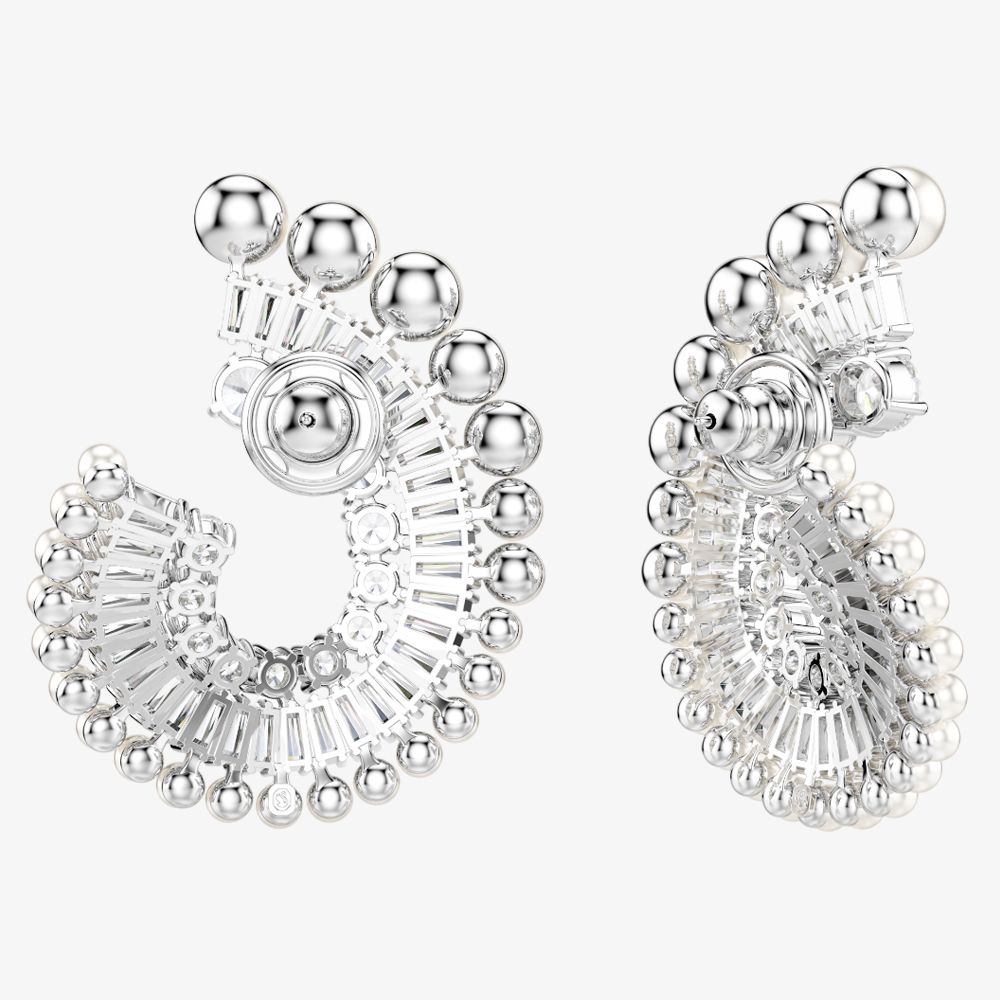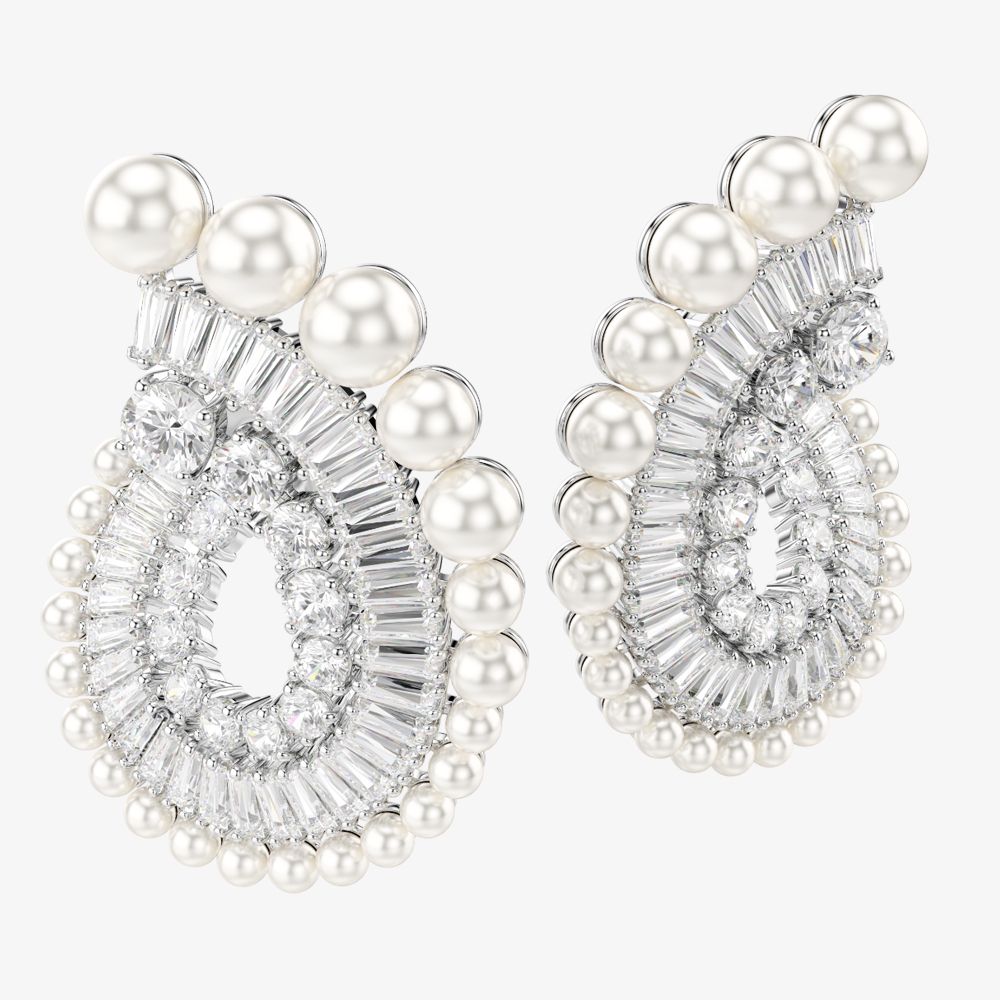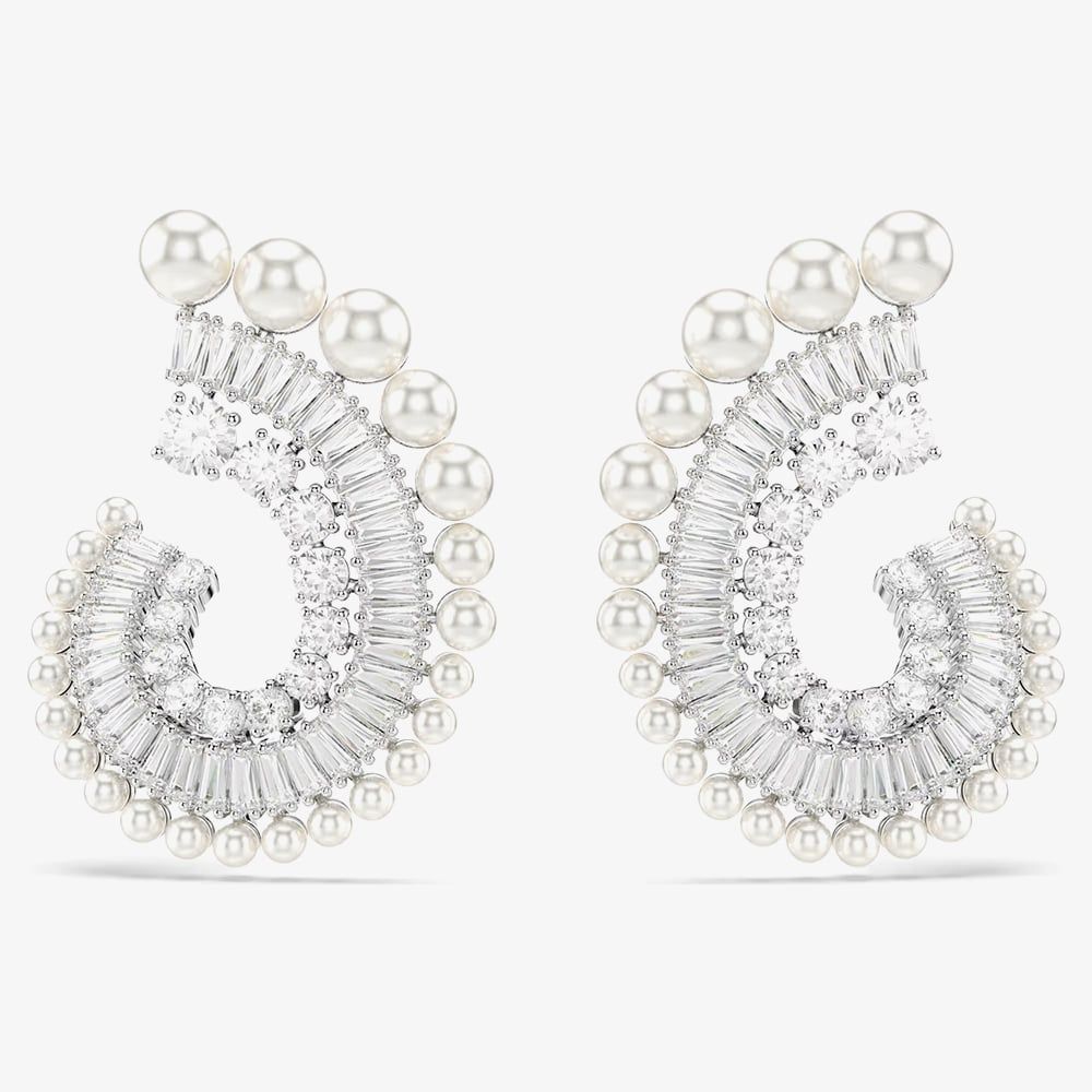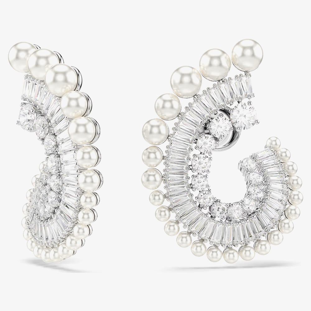 Infused with Swarovski flare, these striking pierced earrings are an ultra-modern way to elevate any outfit. Each rhodium plated piece features an open spiral of round and baguette-cut Swarovski Zirconia in a gradient of sizes. On the outer section, the design is completed by a gradient of Swarovski Crystal Pearls, which deliver a luxurious and captivating touch. A bright and beautiful pair of earrings that can be easily matched with other pieces from the same creative family.