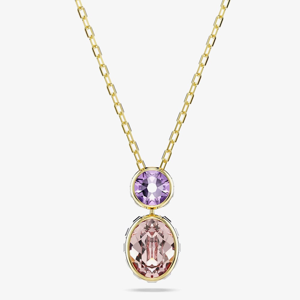 Versatile and elegant, the Swarovski Chroma Gold Plated Mixed Cut Crystal Pendant Necklace features a purple crystal pendant with a pink crystal below that can be reversed to reveal a sparkling white crystal, offering two looks in one. Finished with an adjustable chain and lobster clasp, this stylish necklace adds a touch of refined sparkle to any outfit.