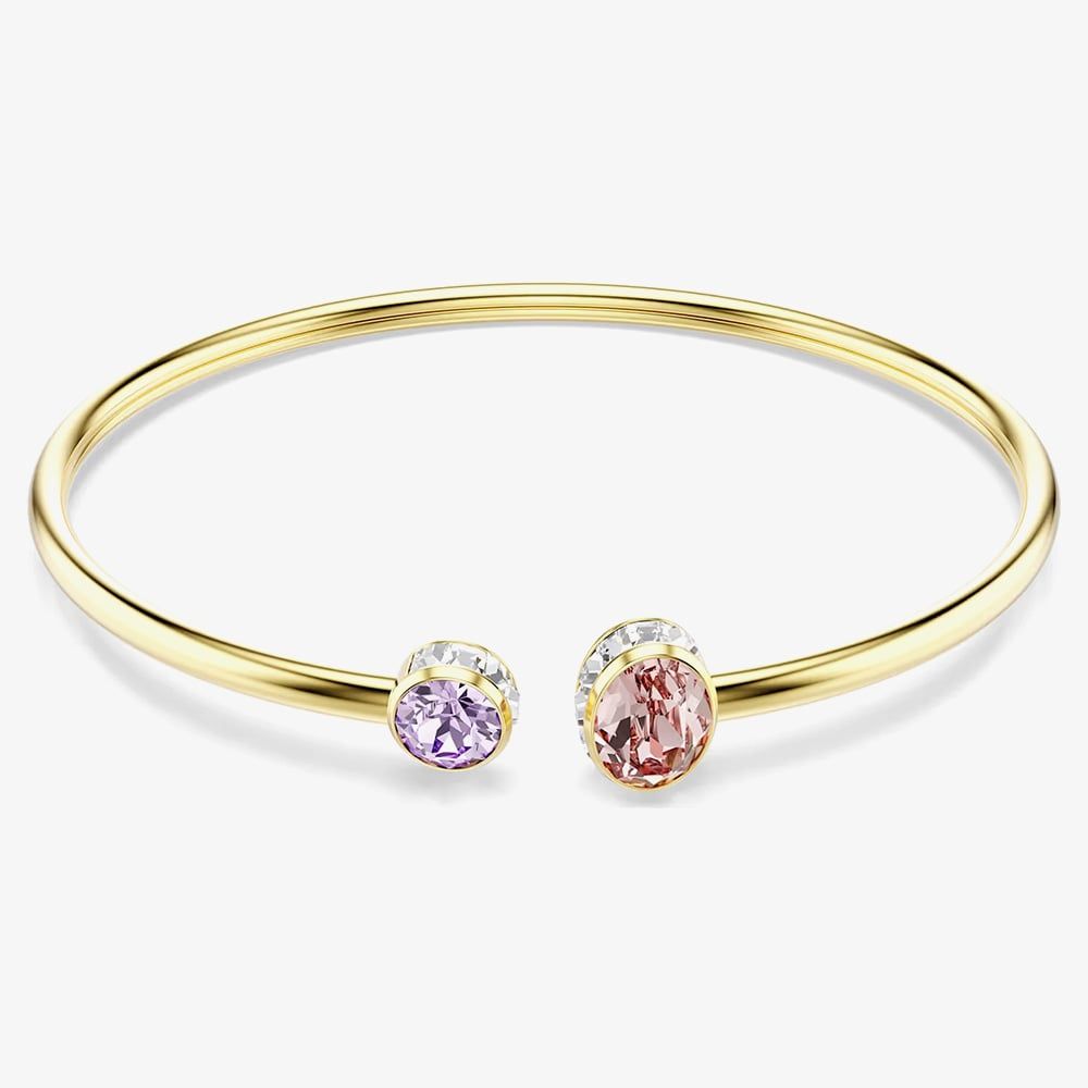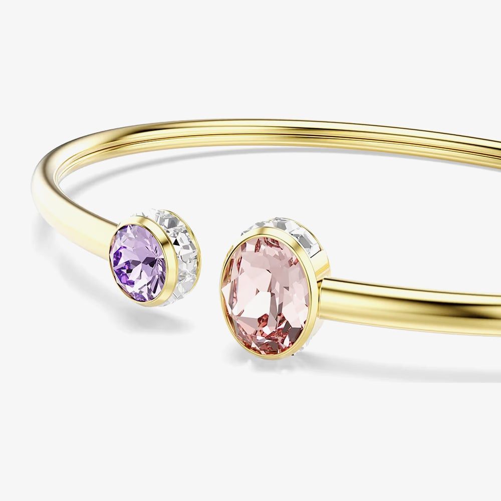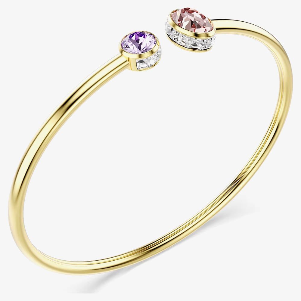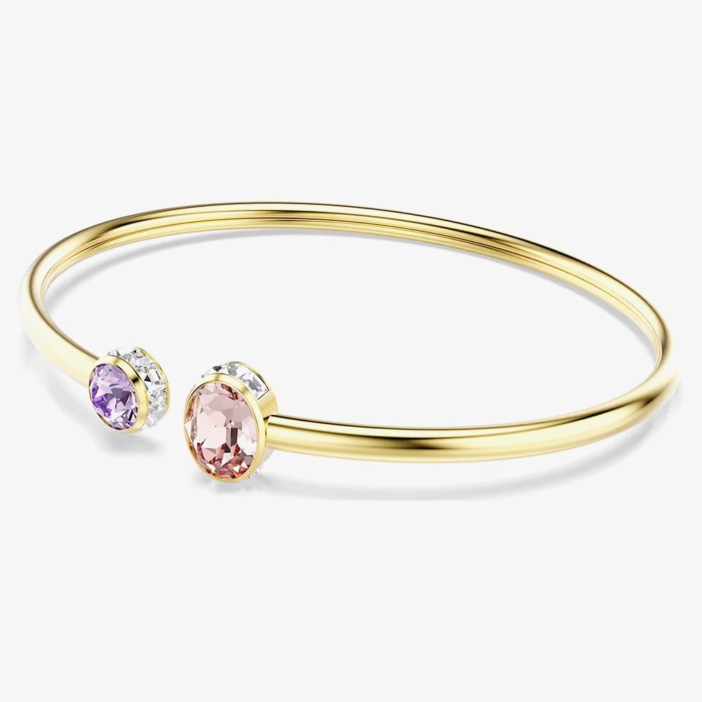 Elegant and contemporary, the Swarovski Chroma Gold Tone Plated Mixed Cut Crystal Bangle features a flexible open torque design for a comfortable fit. The pink and purple Swarovski crystals at each tip beautifully complement the warm gold-tone metal, adding a soft, feminine touch. Measuring 16.7cm, this stylish bangle is perfect for layering or wearing alone as a refined statement piece.