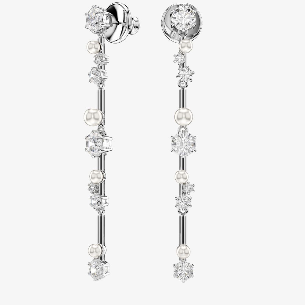 Like trails of stardust, these dangling Constella earrings are filled with magic and light. Each piece is rhodium plated and features a cluster of different-sized Swarovski Zirconia and Swarovski Crystal Pearls, which appear to float among the jewellery's metallic bars. A sensational addition to any outfit that will enhance your cosmic glow.