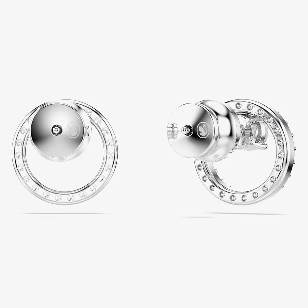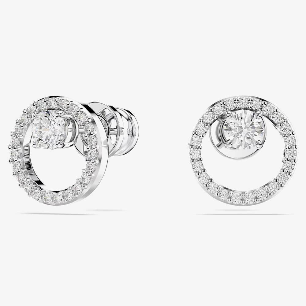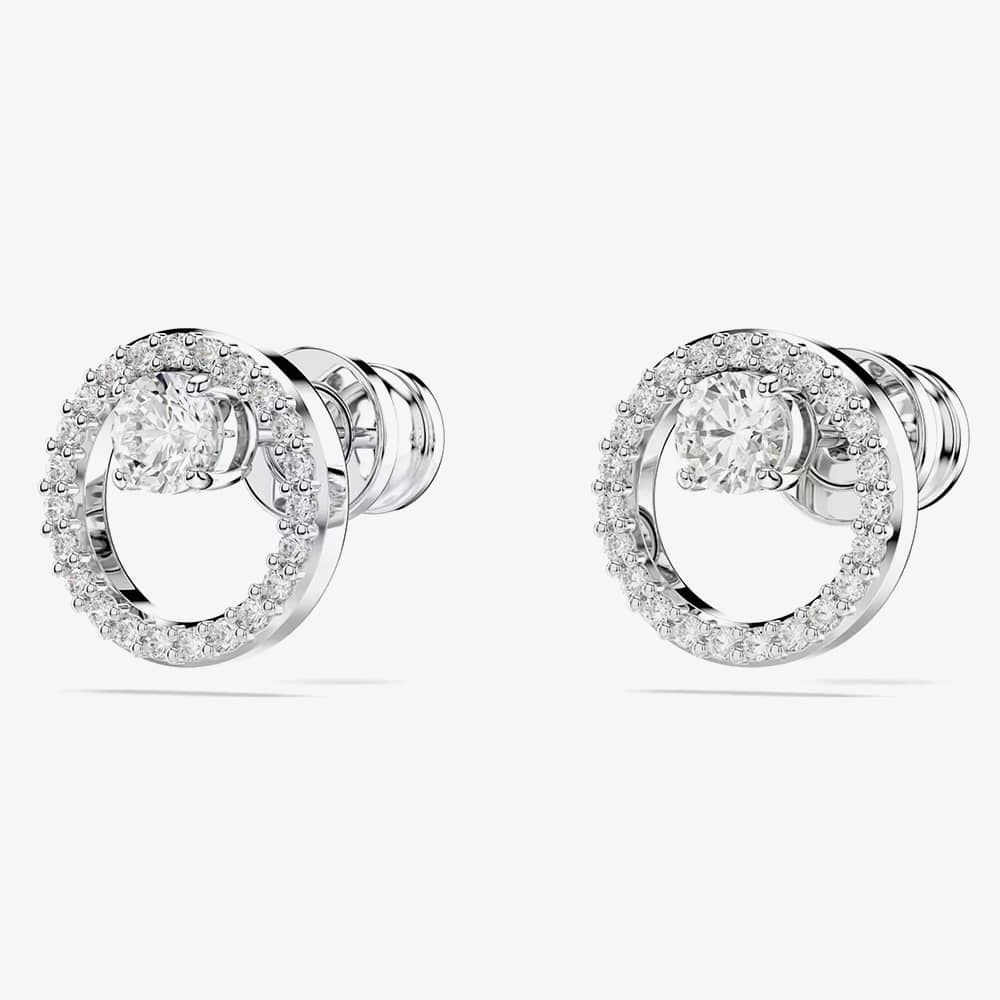 These refined circle studs exude timeless elegance. Each rhodium plated piece features a central pavé ring of clear Swarovski Zirconia, with a single prong-set Swarovski Zirconia placed in the middle.