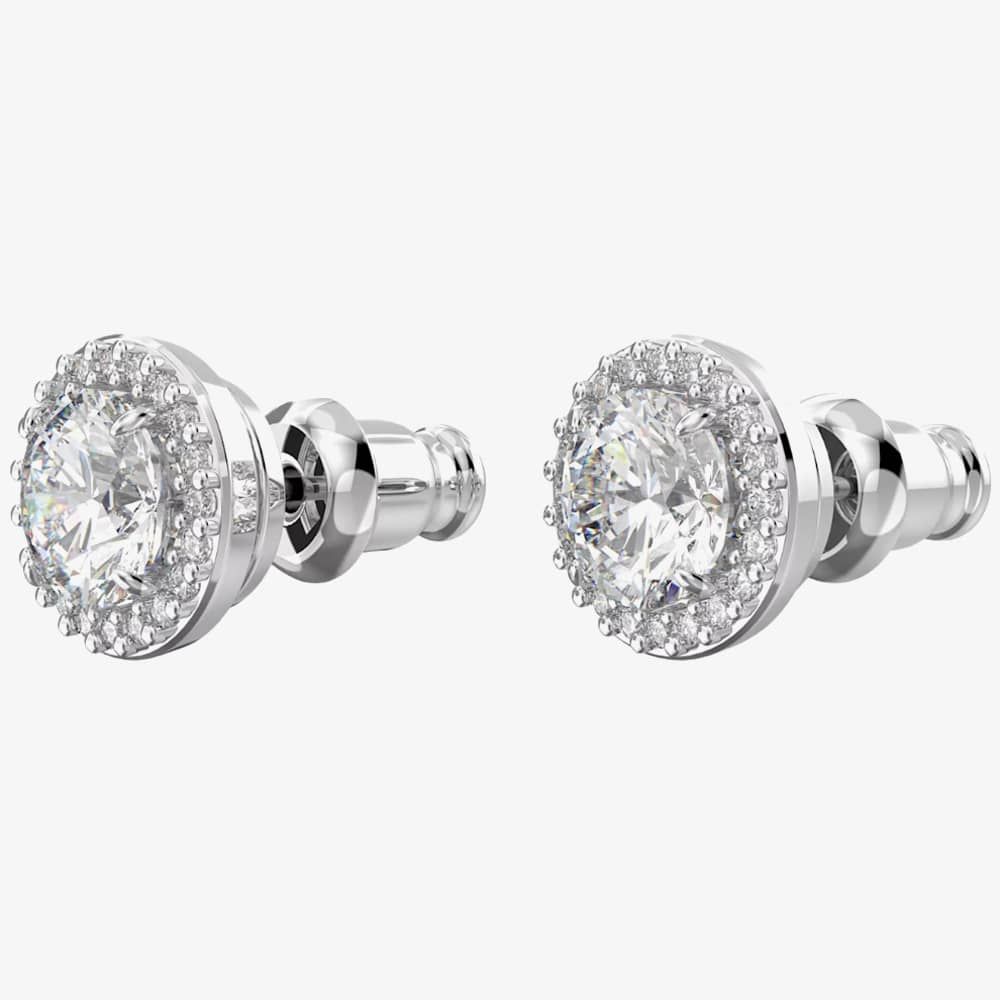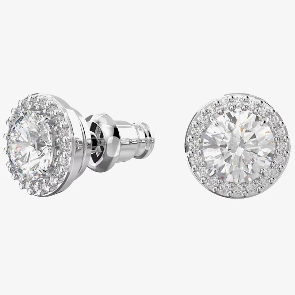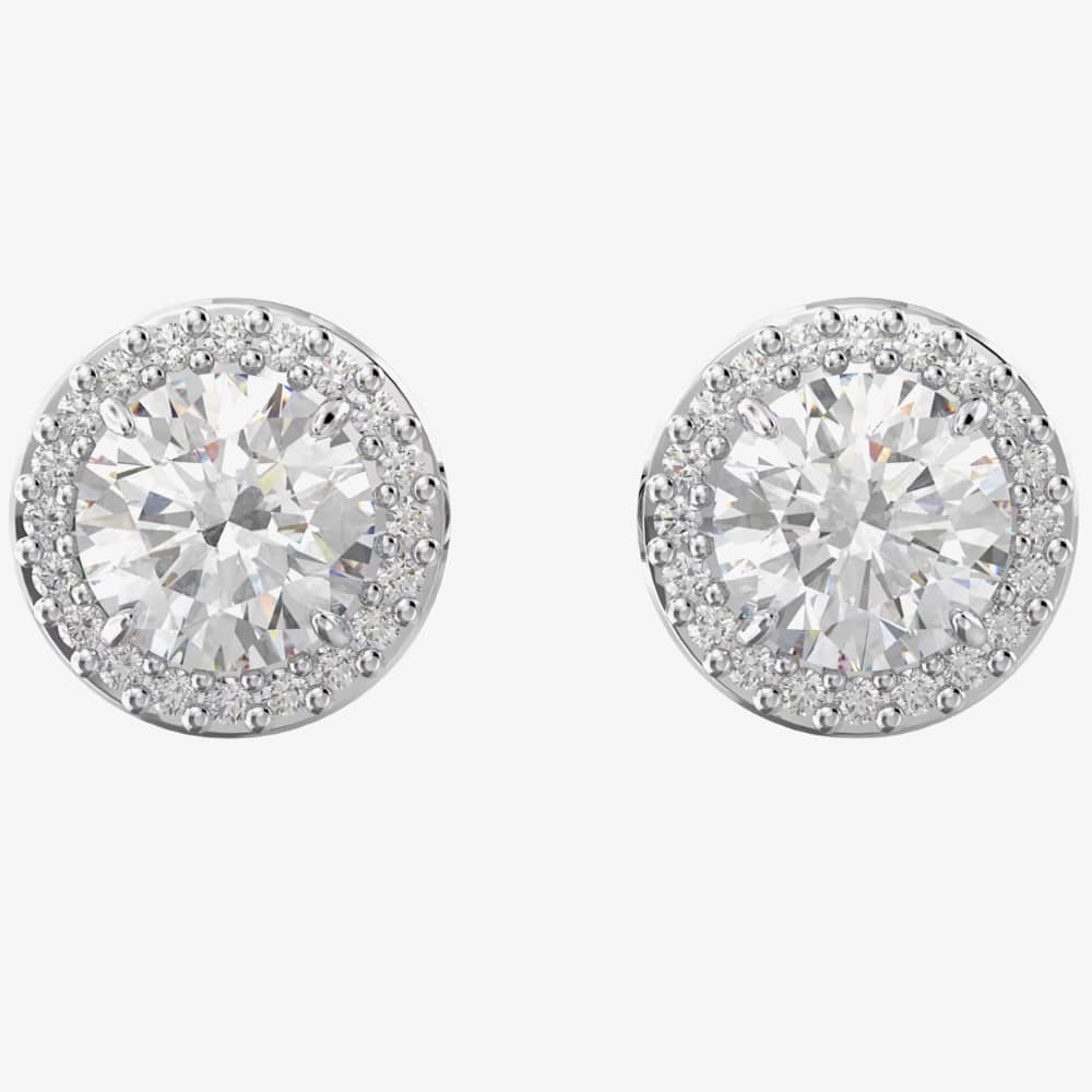 These earrings are delicately crafted from base metal with a silver rhodium plating. These beautiful stud earrings feature a halo of round white cubic zirconia stones, finished with a bullet backing for a secure fitting.