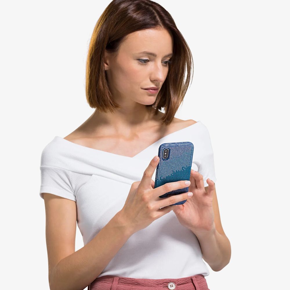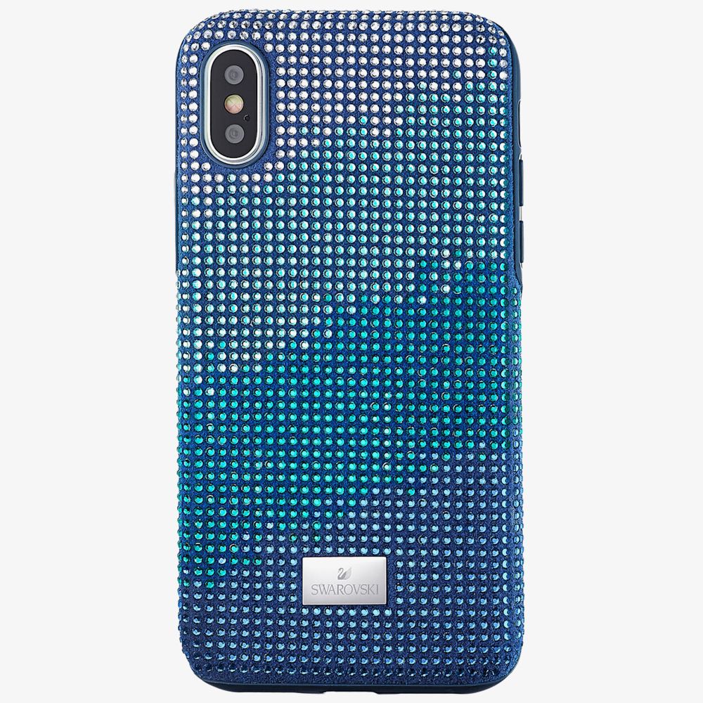 Swarovski Crystalgram Bumper iPhone X/XS Max Phone Case 5533972 is made from thermoplastic polyurethane along with padded corners for added protection. This dazzling phone case features graduated blue tone Swarovski crystals. The Swarovski logo appears on a metallic plate completing this dazzling phone case. Compatible with iPhone X/XS Max phones. Size: 16.2 x 8.2 x 1.1 cm.