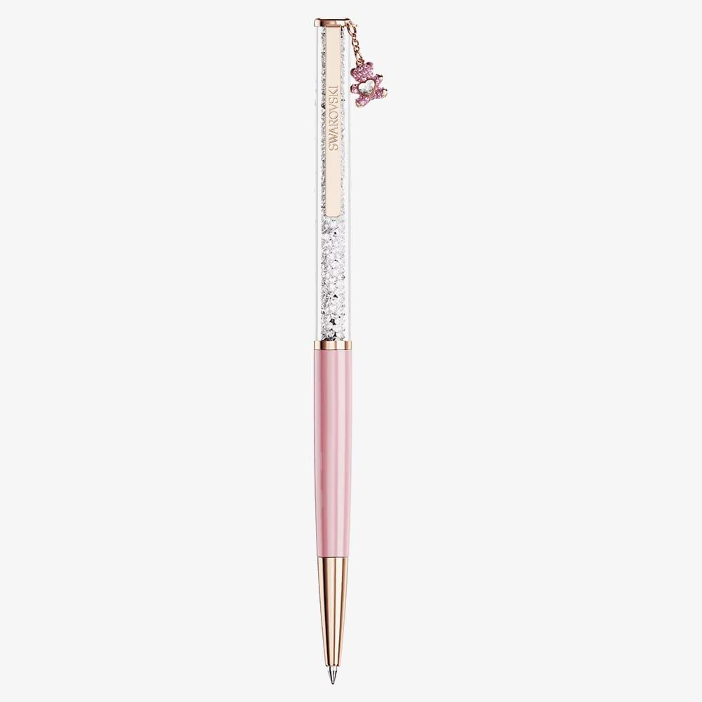 Playful and sparkling, the Swarovski Crystalline Pink Crystal Teddy Bear Ballpoint Pen features a pink lacquered barrel accented with rose gold plating. The pen is filled with approximately 400 clear Swarovski crystals for dazzling sparkle, and a crystal-set teddy bear charm hangs from the top, making it a charming and luxurious accessory for everyday writing.