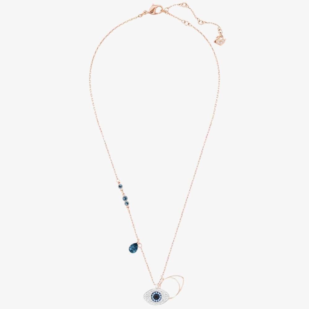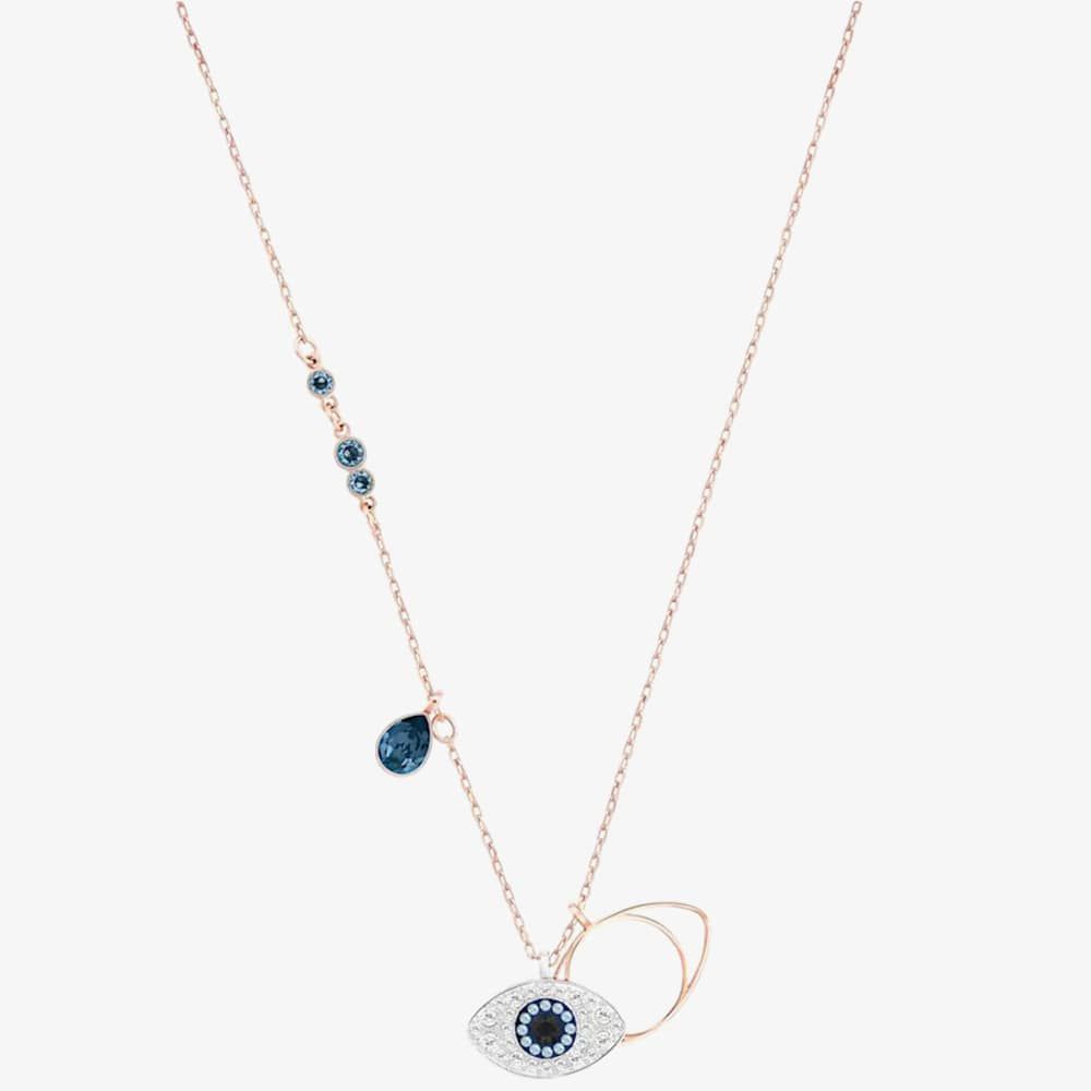 This stunning ladies pendant consists of rose gold tone plated metal that forms an evil eye design. Blue, black and clear crystals also give the piece an extra sparkle.