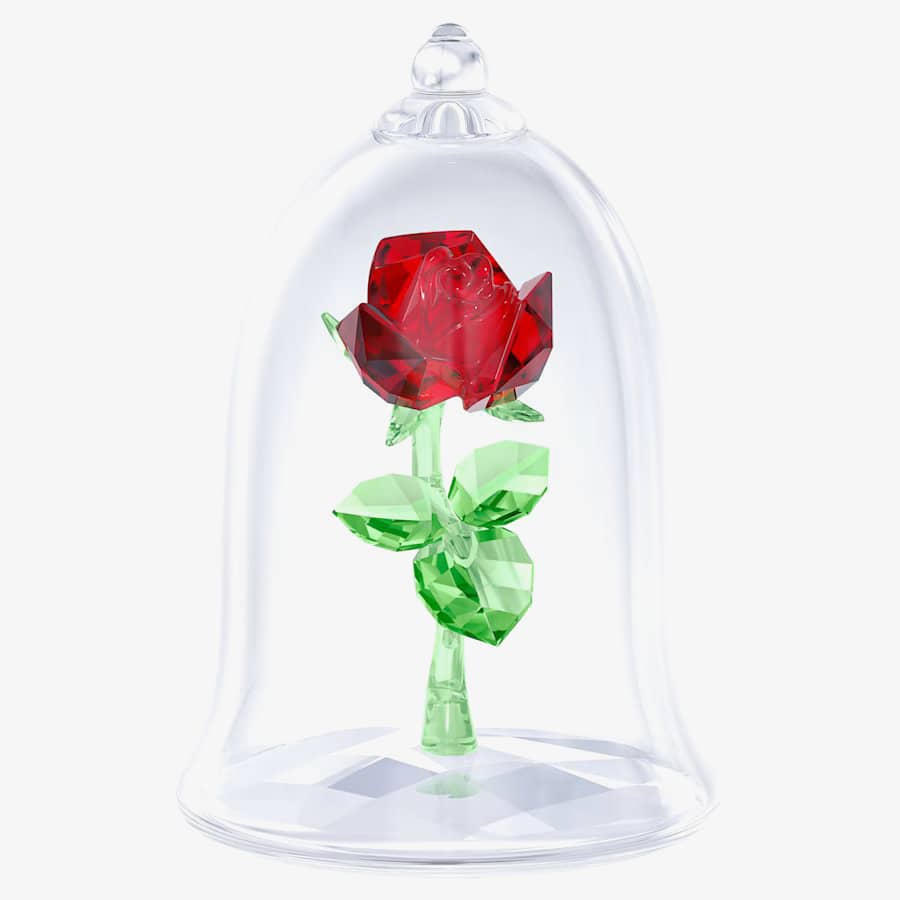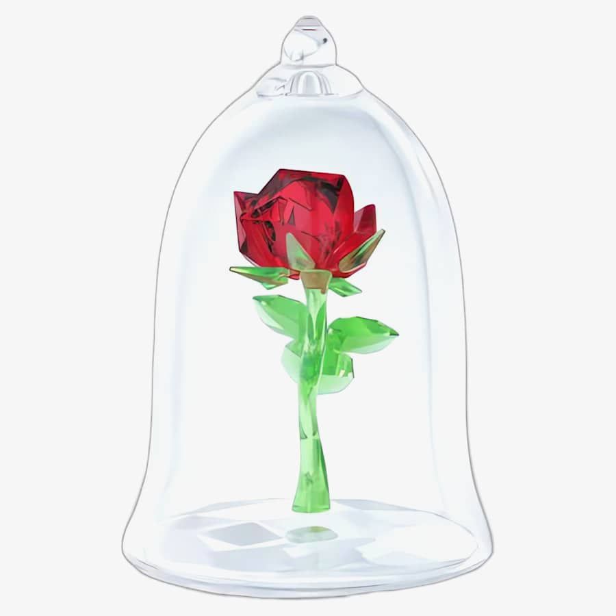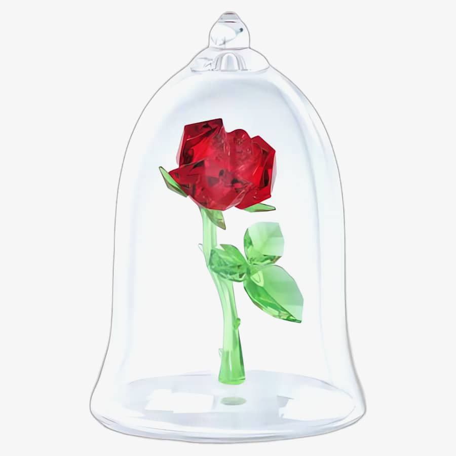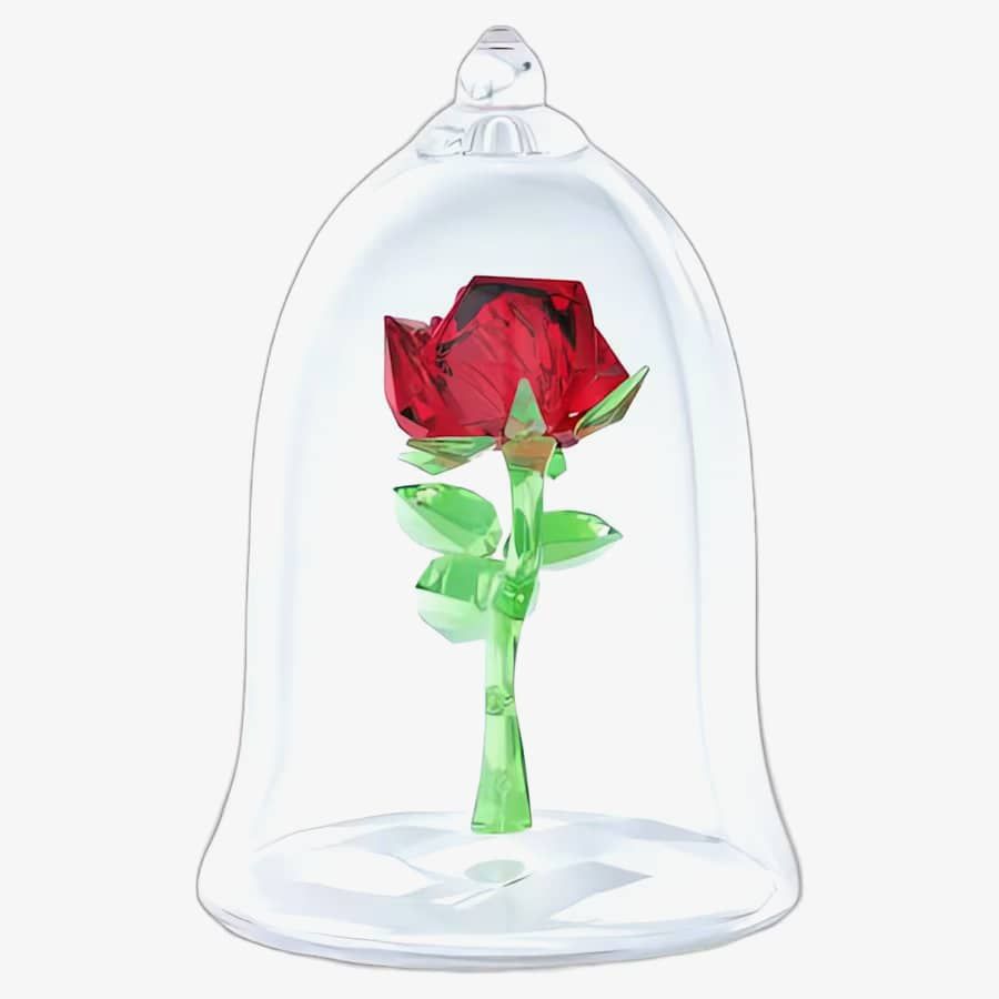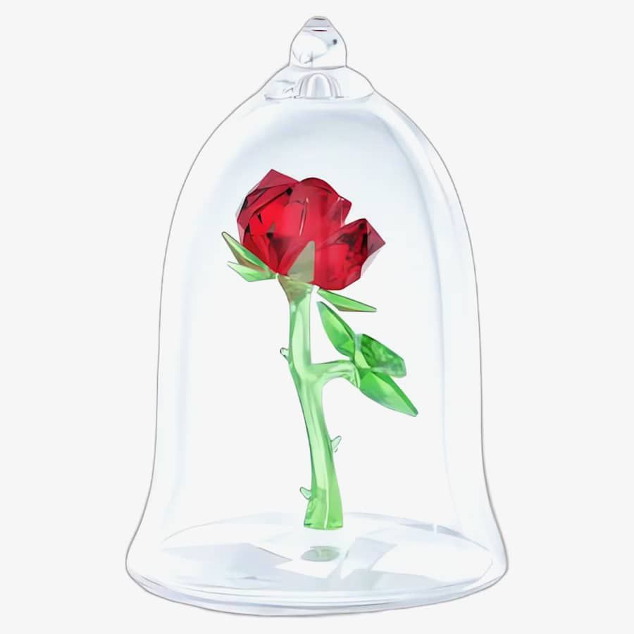 An ideal romantic gift and a must-have for Disney collectors, this authentic piece is a detailed representation of the iconic rose from the movie Beauty and the Beast. The rose is elegantly showcased inside a high-quality, mouth-blown glass bell jar. Crafted with precision, it features red and green crystal elements with a clear crystal base, boasting a total of 223 sparkling facets.