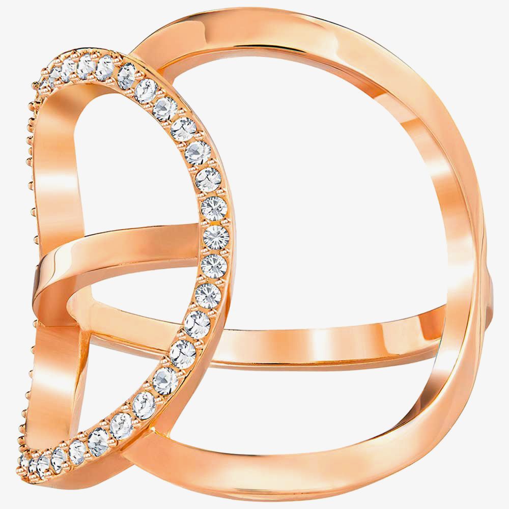 An intricate Swarovski ring that comes with an array of clear crystal stones encrusted in rose gold tone material. Looks great as part of any outfit.