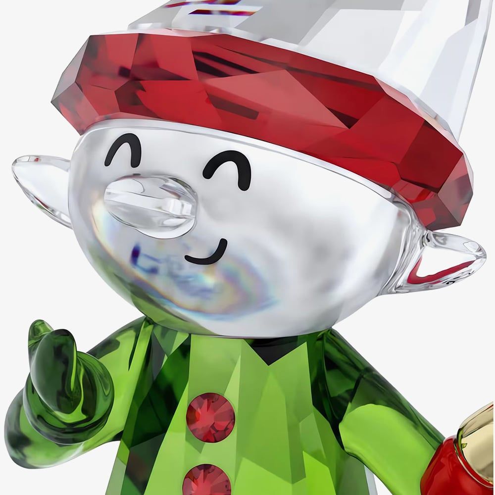 Add joy and charm to your holiday décor with this playful elf figurine. Crafted with 350 sparkling facets, it features festive details like champagne gold-tone metal pom poms and a candy cane accented with red lacquer. Pair it with Santa, sleigh, and gift ornaments to create a magical holiday scene. Please note this is a decoration object and is not suitable for children under 15.