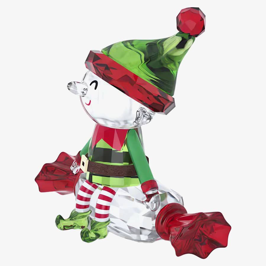 Perched atop a crystallized piece of candy, this playful figurine is a delightful addition to bring festive joy into your home. Crafted with 234 facets, the cheeky design features skilful detailing, including the elf's red and white striped tights and a belt with a gold-tone buckle. The vibrant green and red hues conjure a special holiday charm.