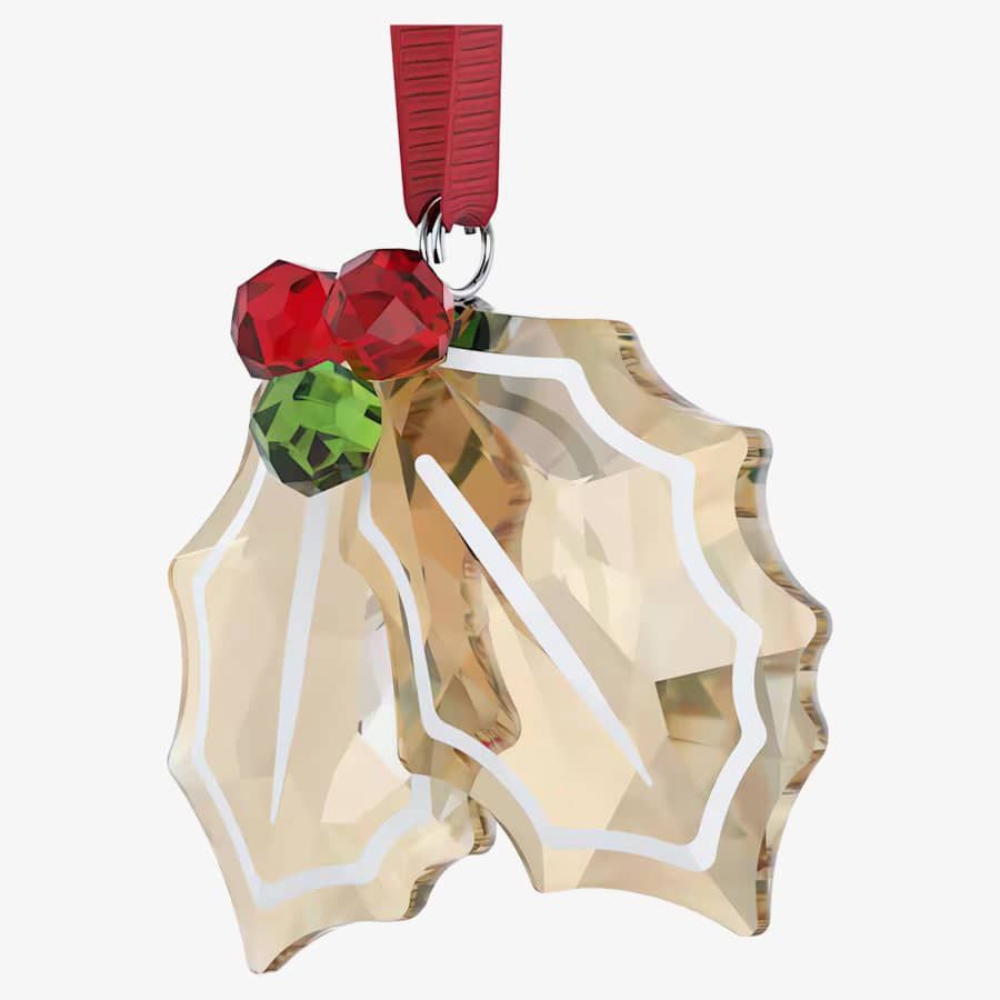 Fashioned in a charming cookie-cut style, this delightful pair of gingerbread holly leaves boasts a golden effect and 164 light-catching facets. Hanging elegantly from a red grosgrain ribbon, these festive holly leaves celebrate the signature foliage of the holiday season.
