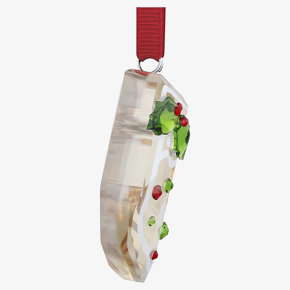 Anticipate Santa's arrival with this delightful gingerbread ornament, capturing the magic of the holidays. Shaped like a stocking, it features a golden glow with 170 facets that catch the light beautifully. Enhanced with additional flatbacks, holly leaves, and printed frosting, this piece combines tradition with elegance. Perfect as a gift or for hanging on your tree or in a window display, it comes suspended from a red grosgrain ribbon. Note: Decoration object only. Not a toy. Not suitable for children under 15.