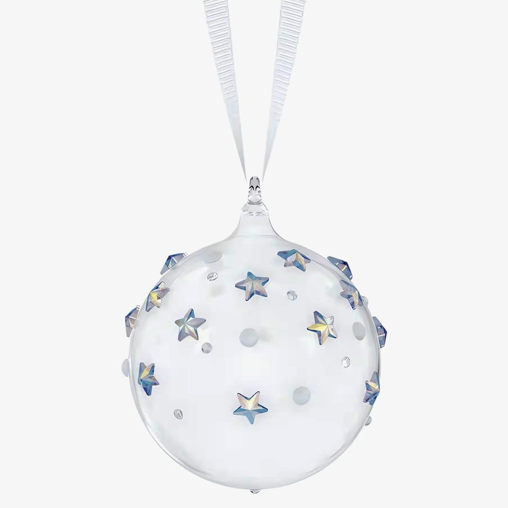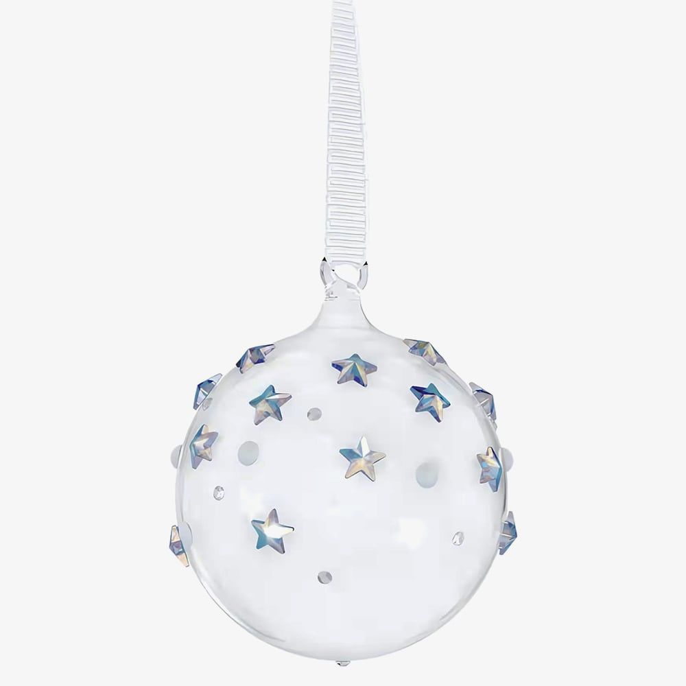 For the first time, Swarovski presents a miniature version of its classic ball ornament. The pristine glass design is adorned with both faceted and unfaceted round crystals, along with 22 stars featuring the mesmerizing Aurora Borealis effect. The ornament boasts a total of 473 facets and is suspended from a white grosgrain ribbon attached to a silver-tone metal fitting. Display this piece in your home to enjoy its delicate beauty. This is a decorative object, not a toy, and is not suitable for children under 15.