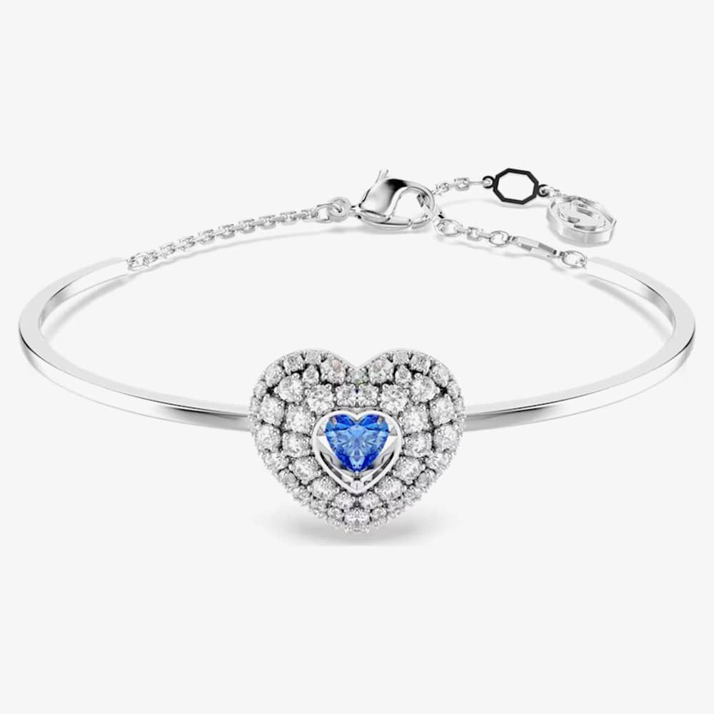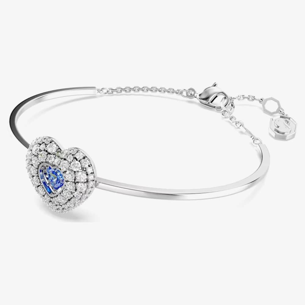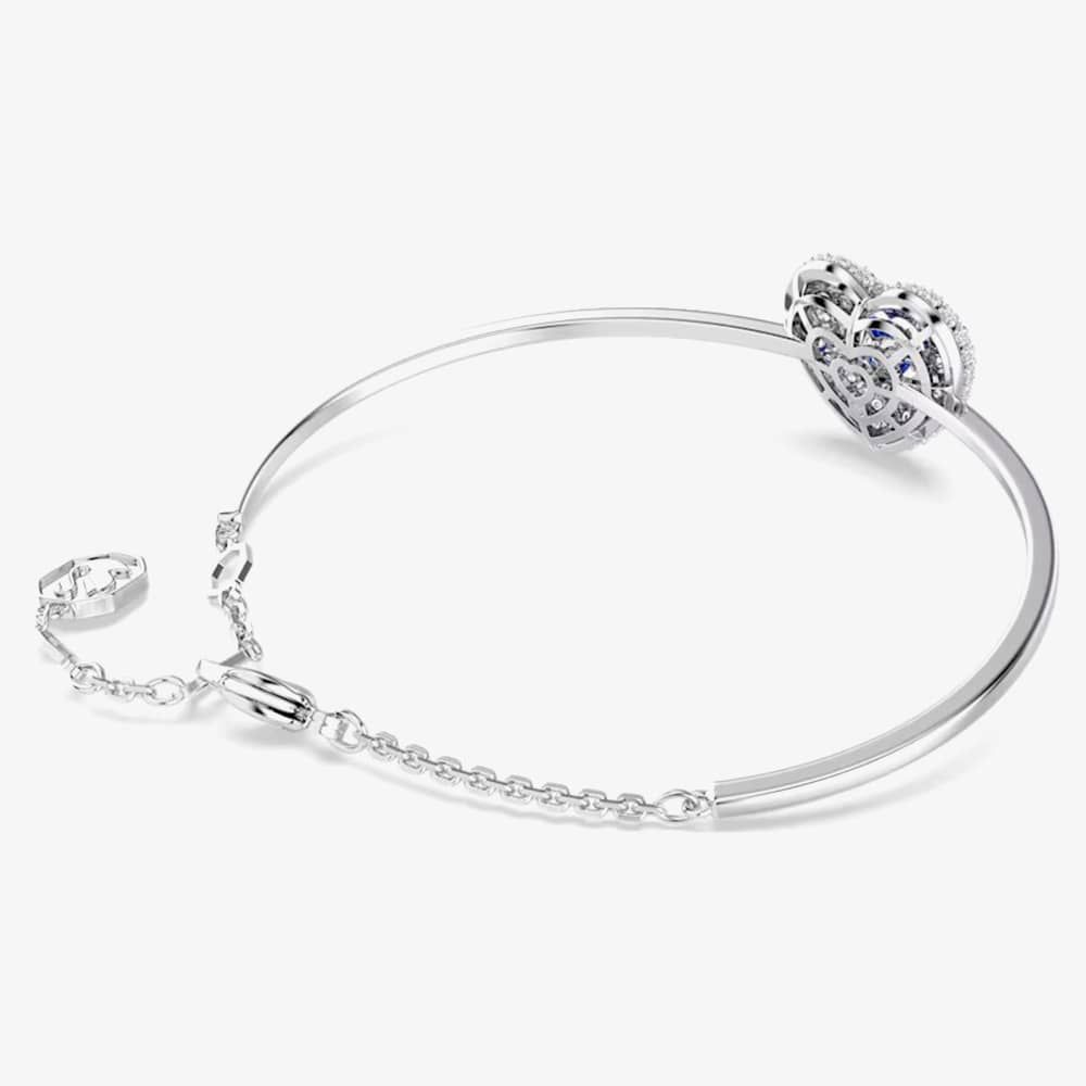 Radiating pure sophistication, this Hyperbola bangle plated in rhodium exquisitely showcases an iconic symbol of love. The heart-shaped motif is intricately designed with a cage structure for maximum volume. To amplify the domed effect, it is adorned with round clear Swarovski Zirconia, meticulously set using the dazzling chatonnage technique. Positioned at the centre, a heart-shaped dancing stone in blue captures light from every angle.