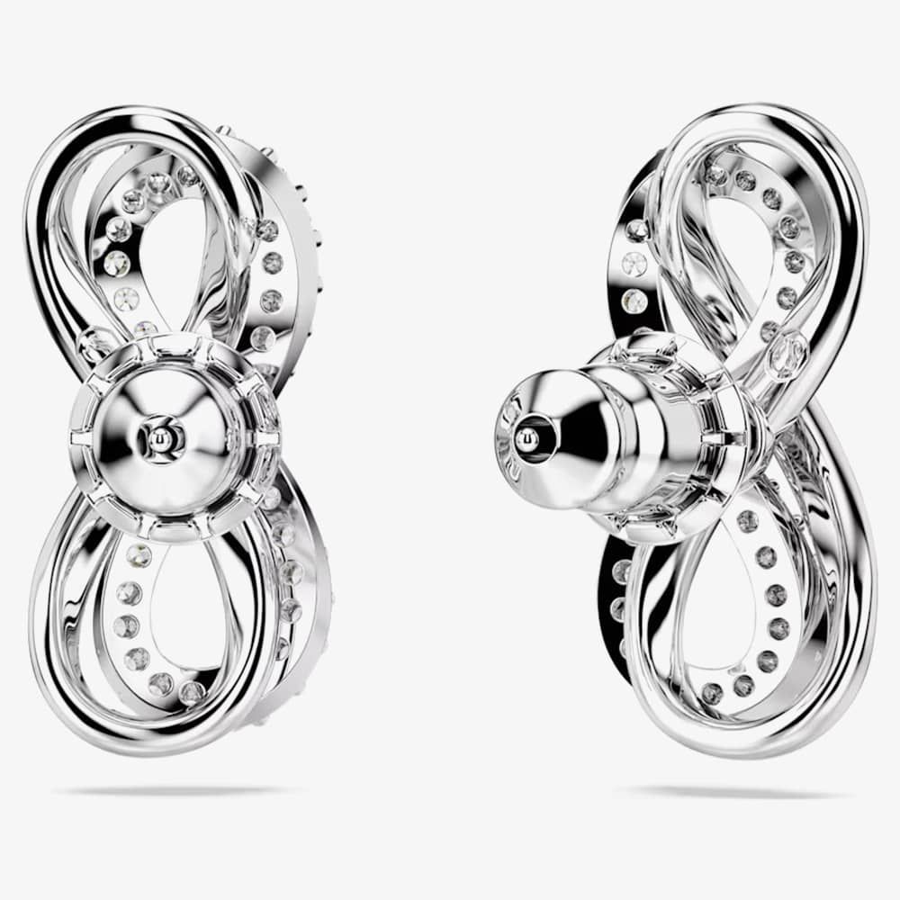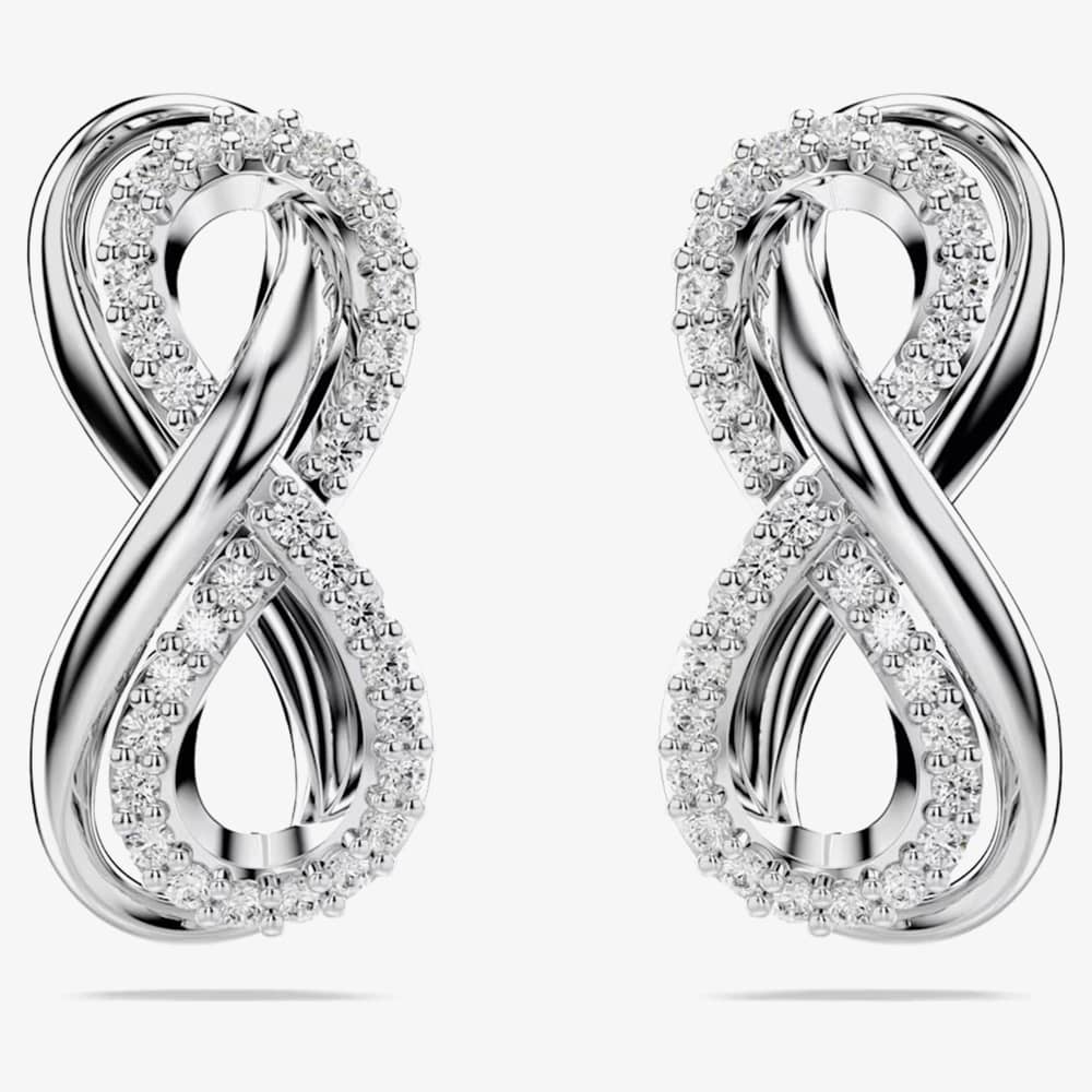 Crafted in rhodium-plated metal, each piece takes the form of an infinity motif and is adorned with an array of clear Swarovski Zirconia.