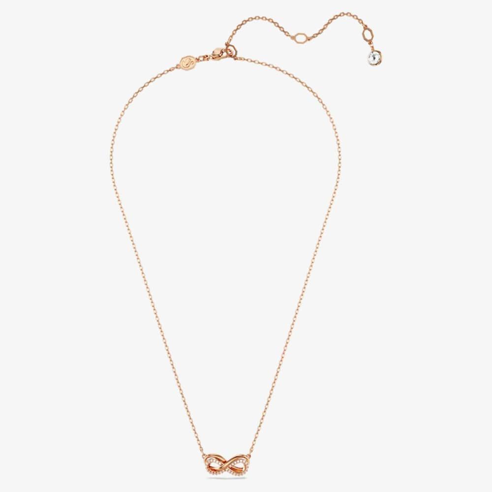 This radiant Hyperbola pendant stands out with its infinity symbol, a timeless representation of enduring beauty. The necklace is plated in rose gold-tone, hangs delicately on a chain, and its graceful motif is adorned with a pavé of clear crystals. An additional touch of luxury is added with a single Swarovski Zirconia placed in the elongation.