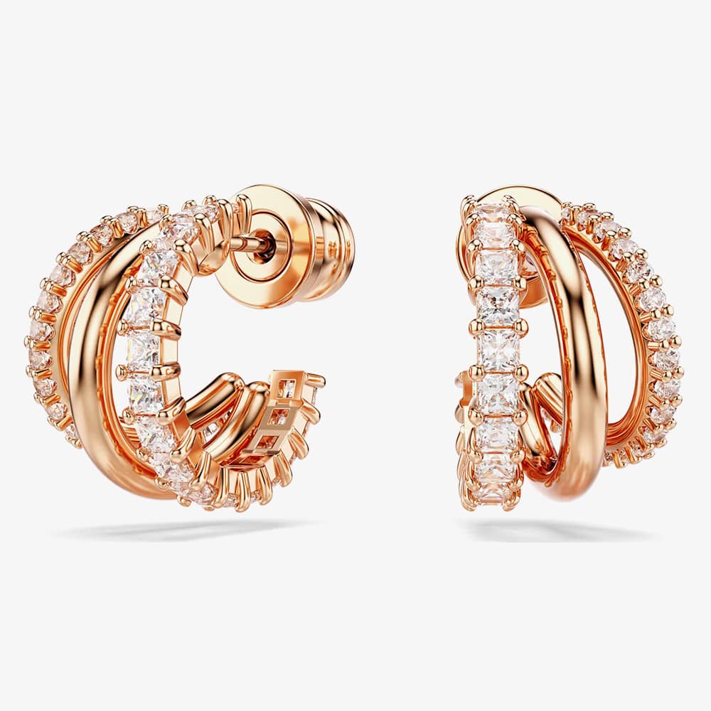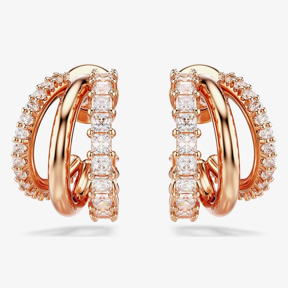 These intricately crafted Hyperbola earrings exhibit a distinctive beauty. Each side features three mini hoops in rose gold-tone plating, embellished with round and square-cut Swarovski Zirconia in a prong setting.