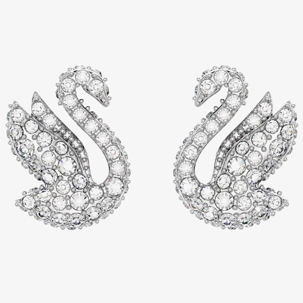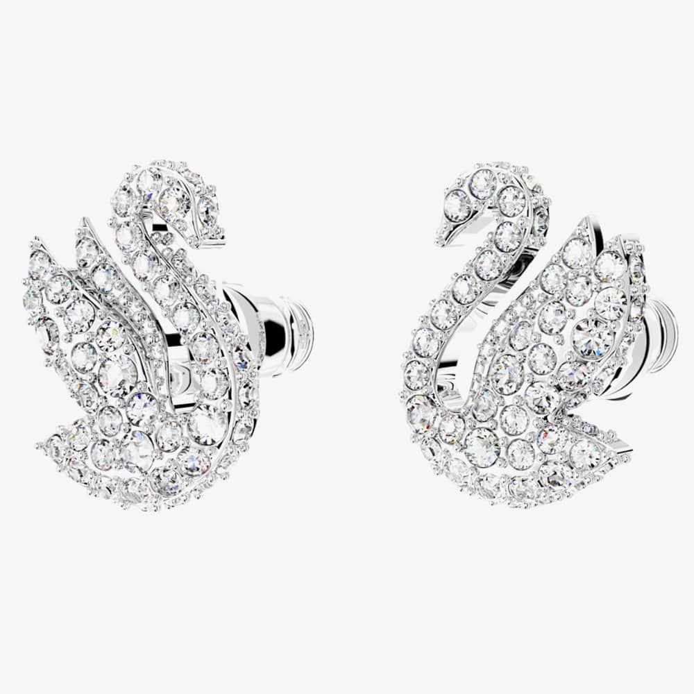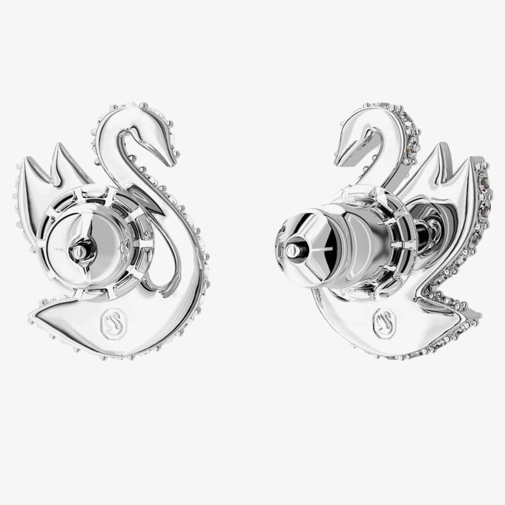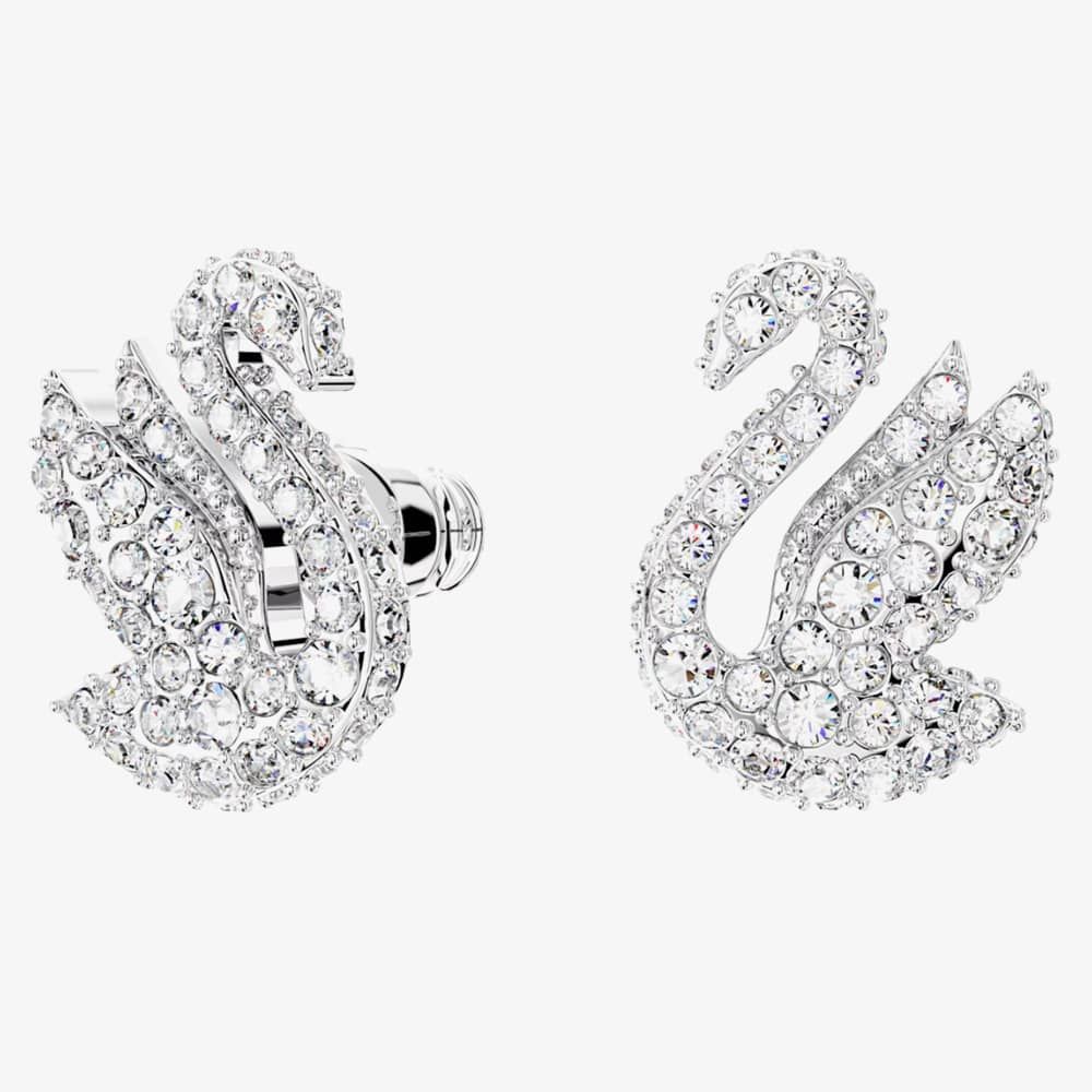 The Swarovski Iconic Small Swan Stud Earrings are delicately crafted from base metal with silver rhodium plating. These beautiful stud earrings feature the iconic swan motif adorned with clear Swarovski crystals, securely fastened with a bullet earring backing. Length: 1.2cm. Width: 1cm. Weight (individually piece): 1g.