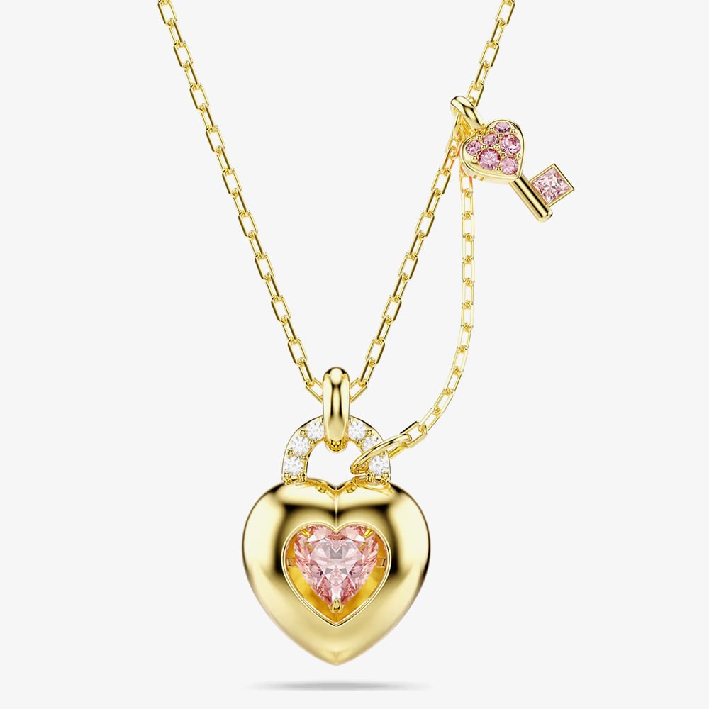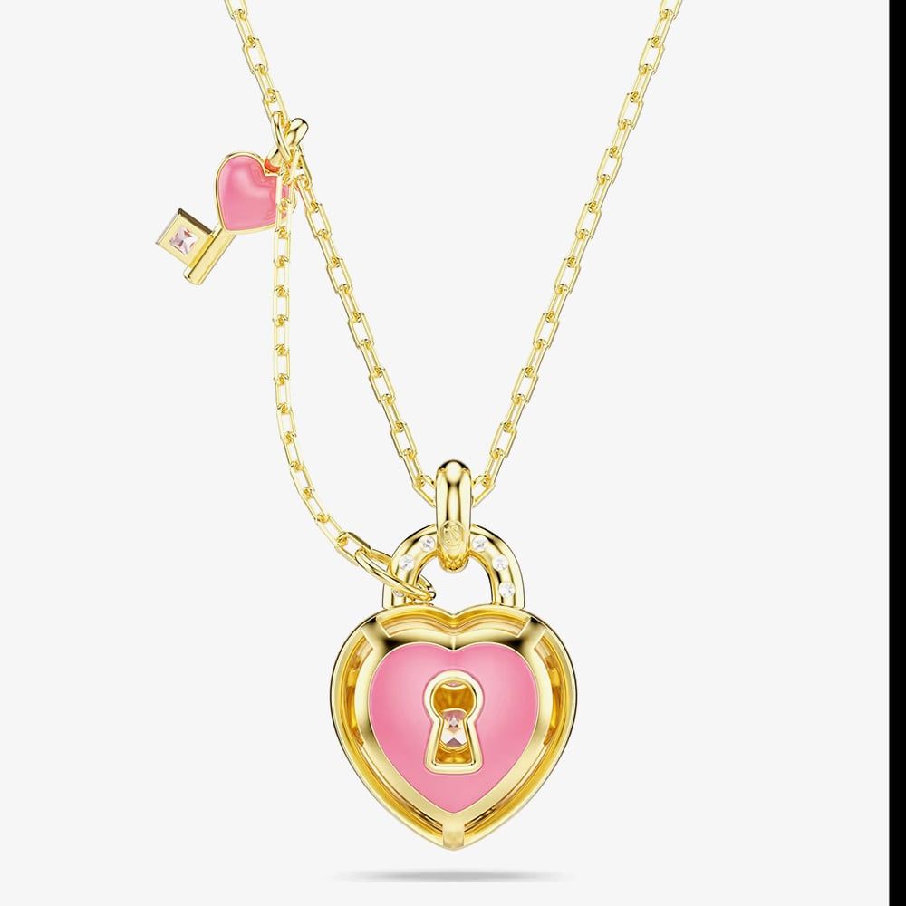 Celebrate love with the Swarovski Idyllia Gold Tone Plated Pink Heart Key Necklace. Inspired by lock-and-key designs, this charming necklace features a heart-shaped padlock pendant set with a sparkling pink Swarovski crystal, paired with a coordinating key pendant also adorned with pink crystals. Finished in gold-tone plating and adjustable in length, it’s a sweet and romantic piece, perfect for Valentine’s Day or gifting to someone special.