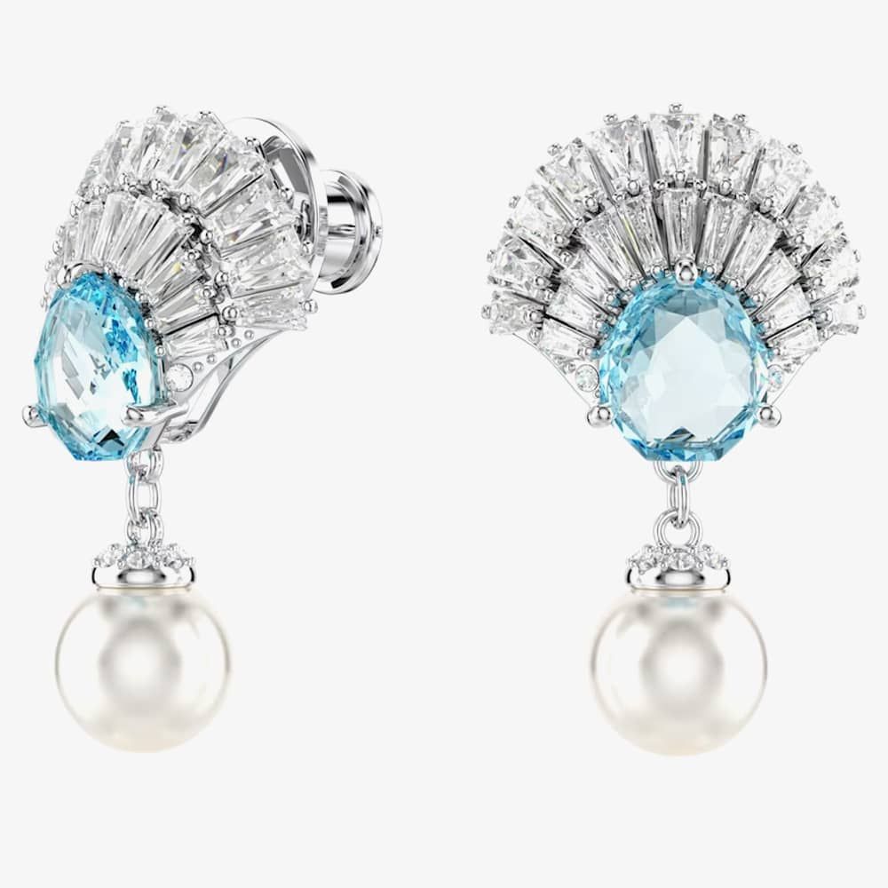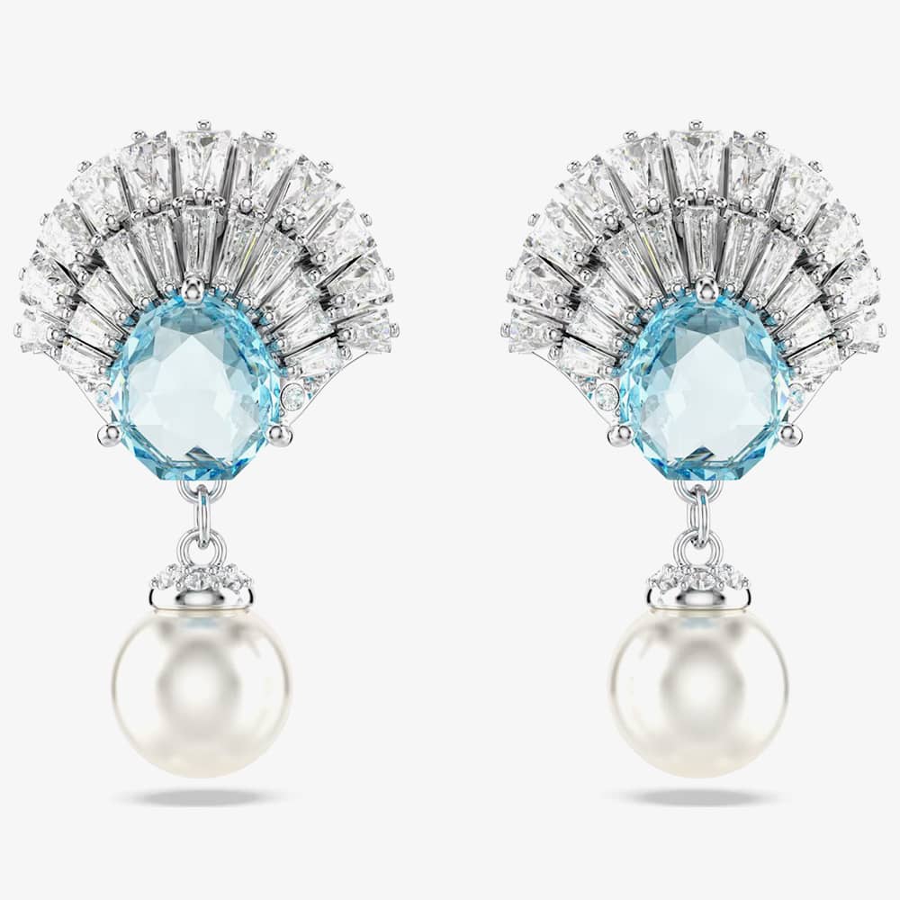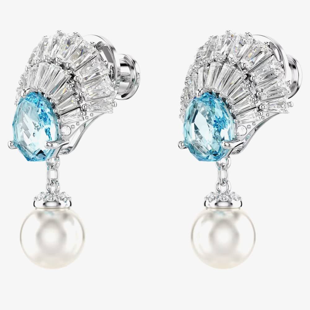 Each shell design is rhodium plated and adorned with a variety of clear Swarovski Zirconia, featuring a bright blue central crystal. Adding an extra touch of sophistication, a single white Crystal Pearl delicately hangs beneath the design.