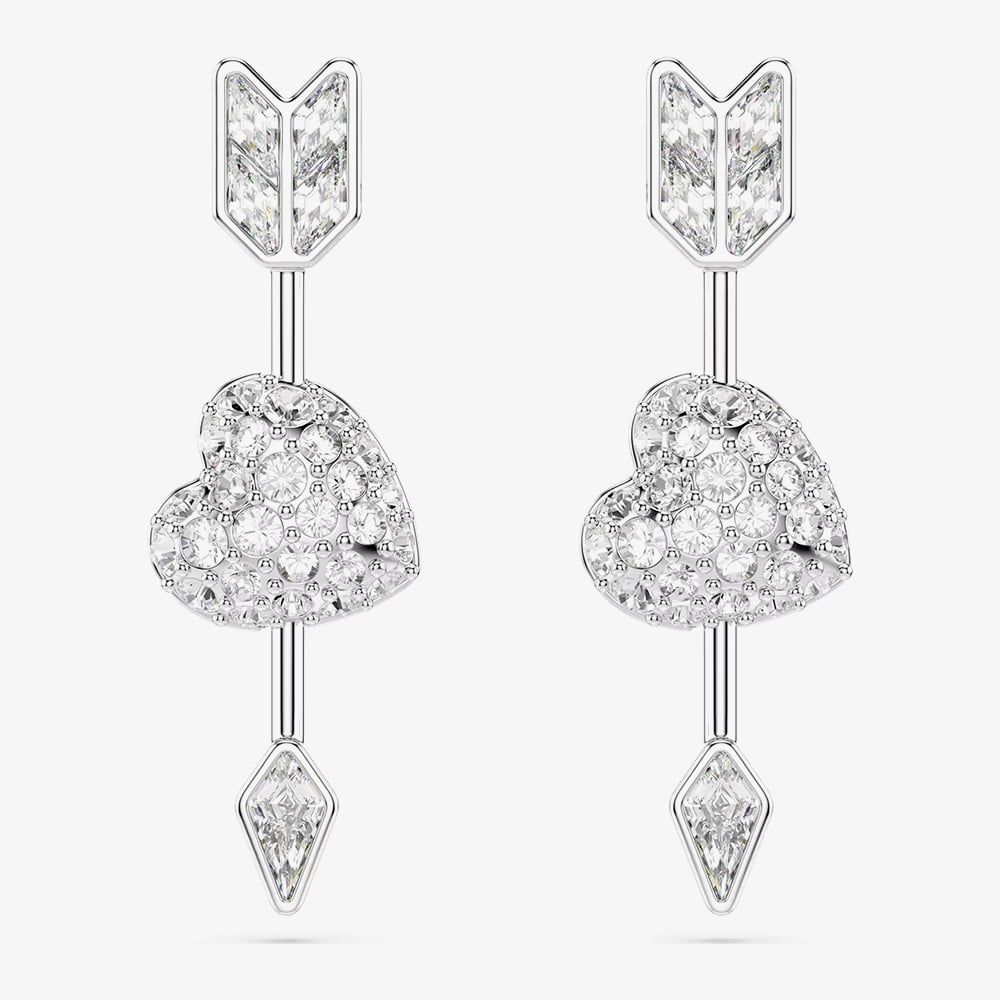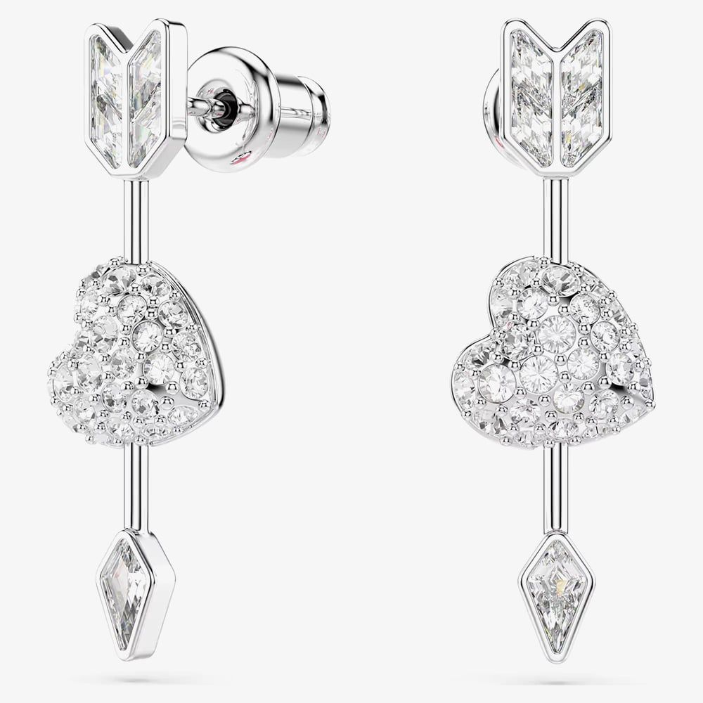 Add playful elegance with the Swarovski Idyllia Rhodium Plated Silver Tone Reversible Arrow Heart Earrings. These rhodium-plated stud earrings feature a heart-and-arrow design, with the centre heart set with sparkling white crystals on one side and sweet pink enamel on the other. The versatile heart can be spun to create two distinct looks, making them a fun and stylish addition to any jewellery collection.
