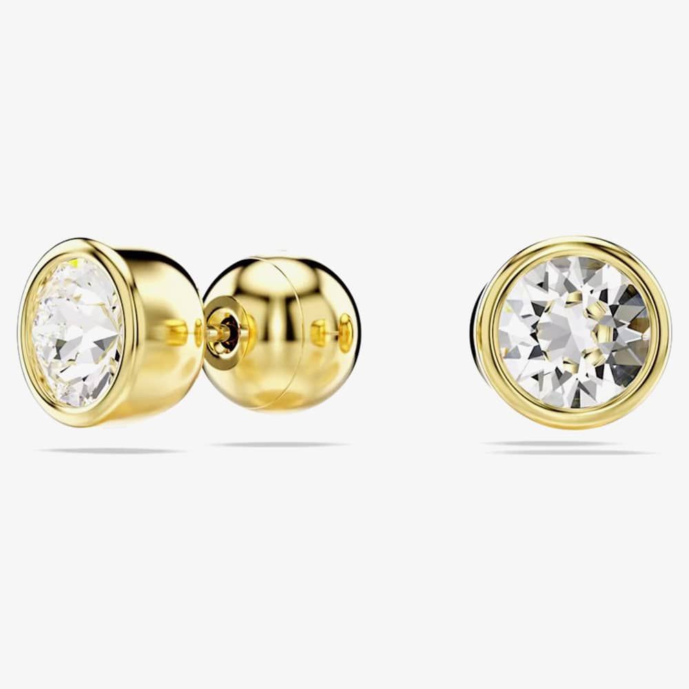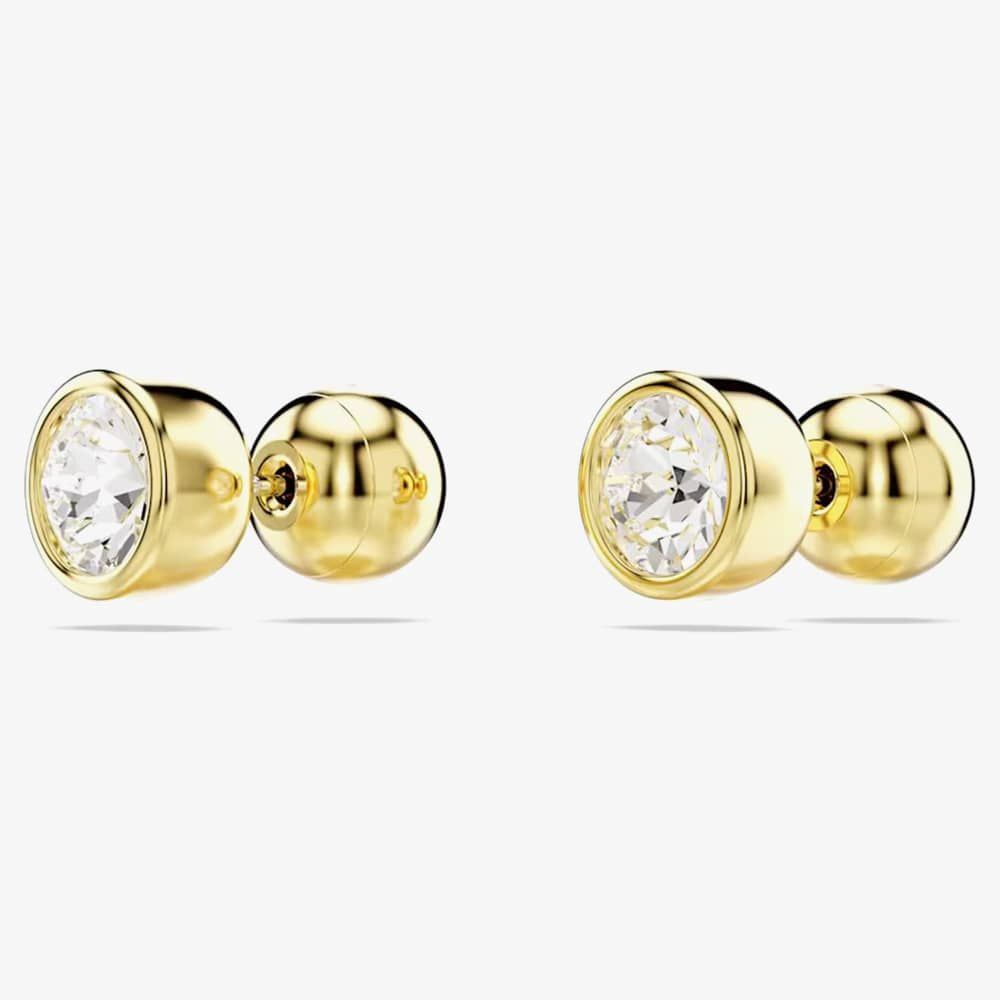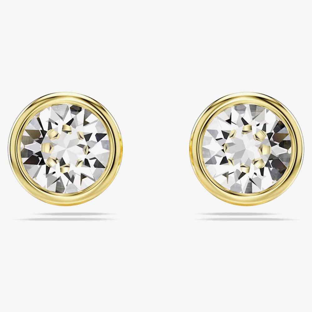 These simple pierced studs showcase Swarovski's expertise in faceting. Crafted in gold-tone plating, each piece highlights a round-cut crystal set in a puffy bezel. An excellent everyday option that effortlessly complements your look.