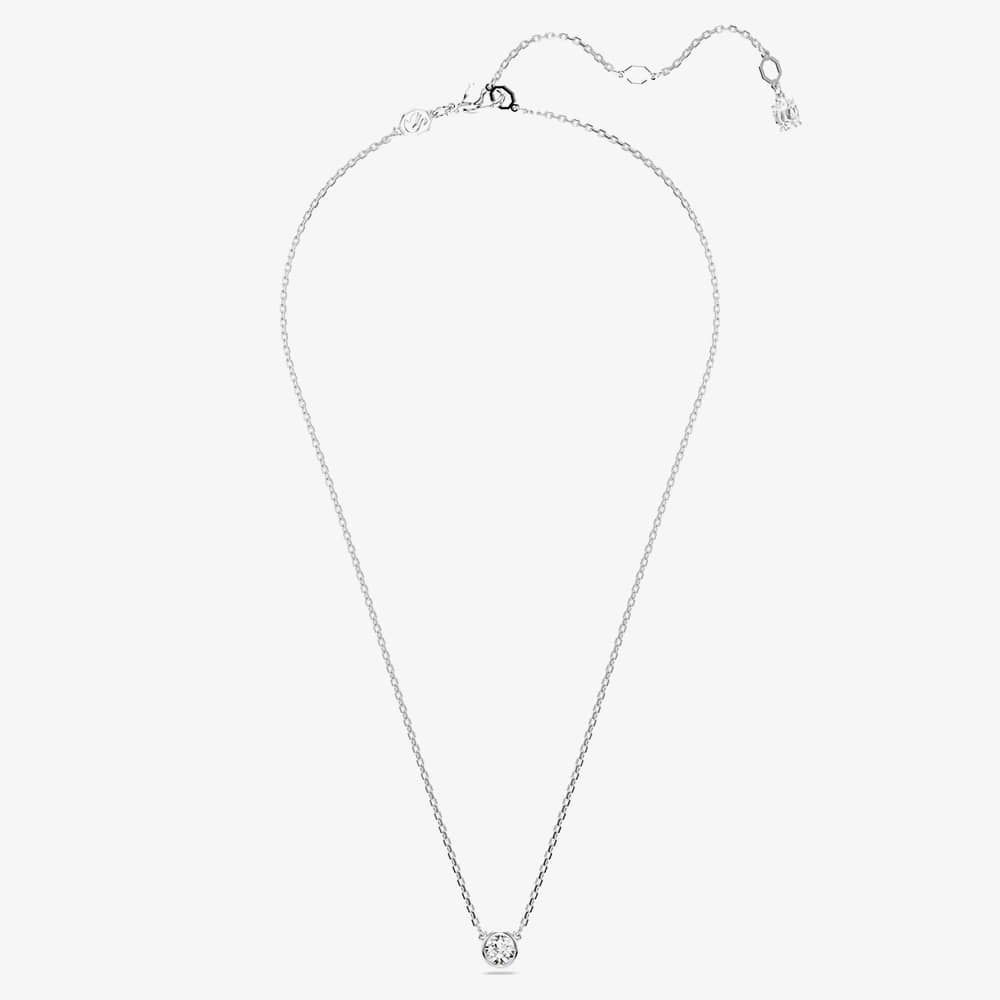 Achieve effortless elegance with this radiant Imber pendant. Hanging from a delicate chain with a lobster closure, the rhodium-plated design features a central round-cut crystal in a puffy bezel setting. An additional Swarovski Zirconia in the elongation adds extra radiance.
