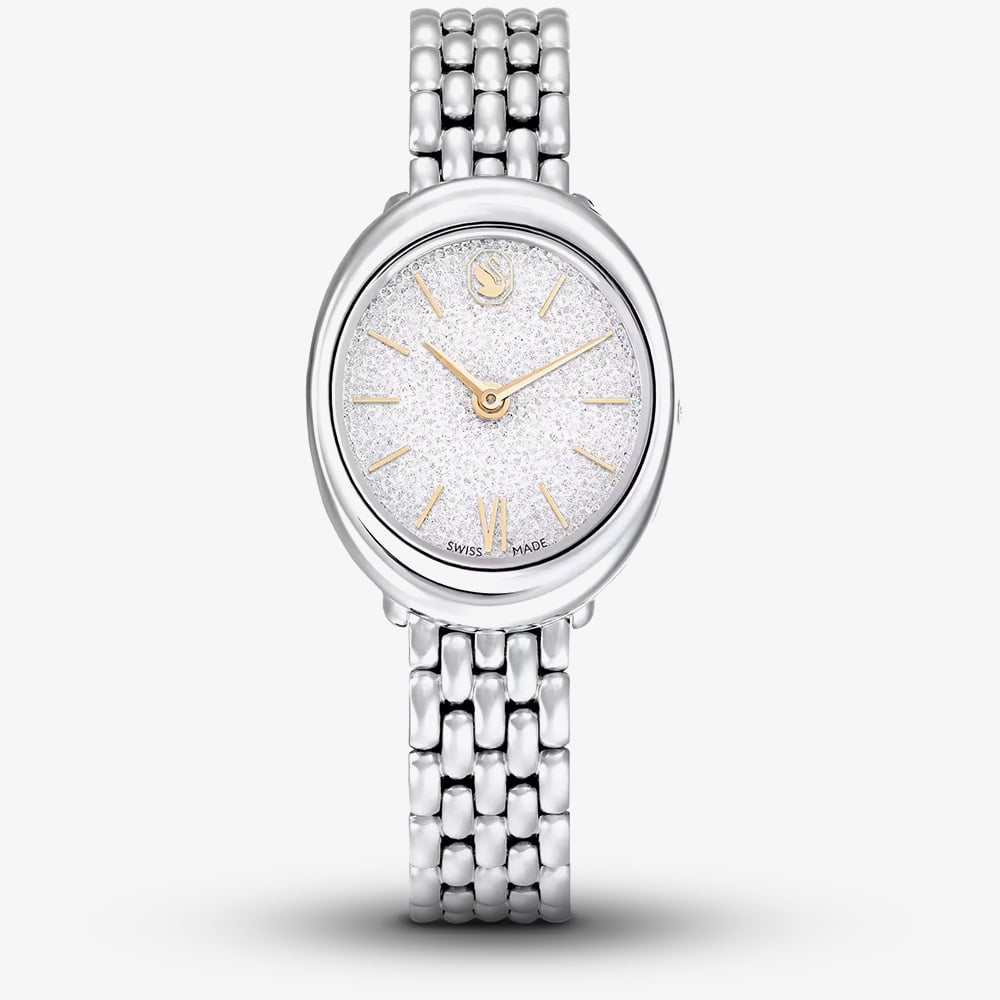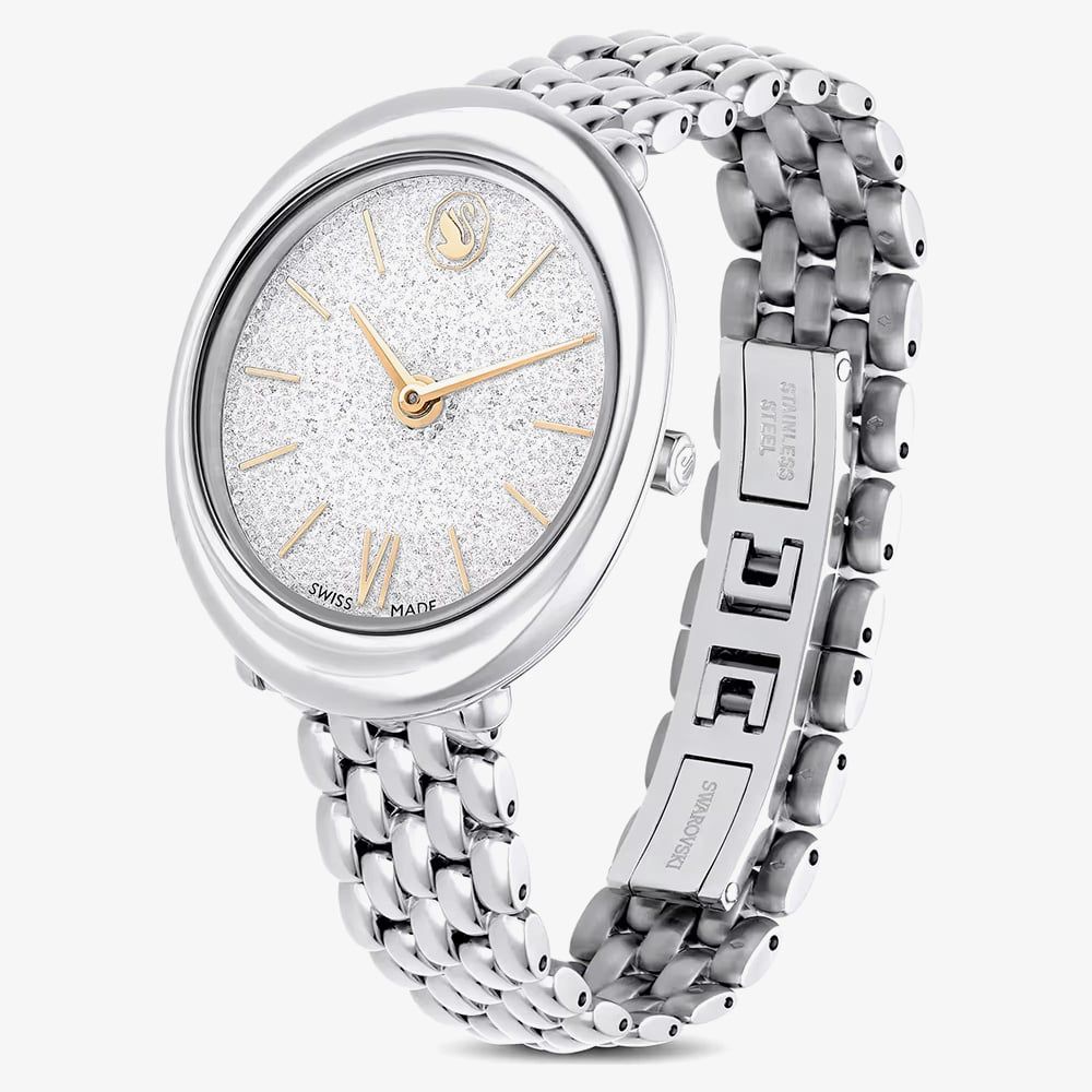 The Imber Oval timepiece is a stunning blend of modern style and elegance. Featuring around 1,000 sparkling crystals on a glittering Crystalline dial, gold-tone details, and Swarovski’s iconic swan logo, this 24 x 26.3 mm stainless steel watch shines day to night. Swiss Made, water resistant to 50 m, and finished with a sleek polished bracelet, make it your go-to statement piece.