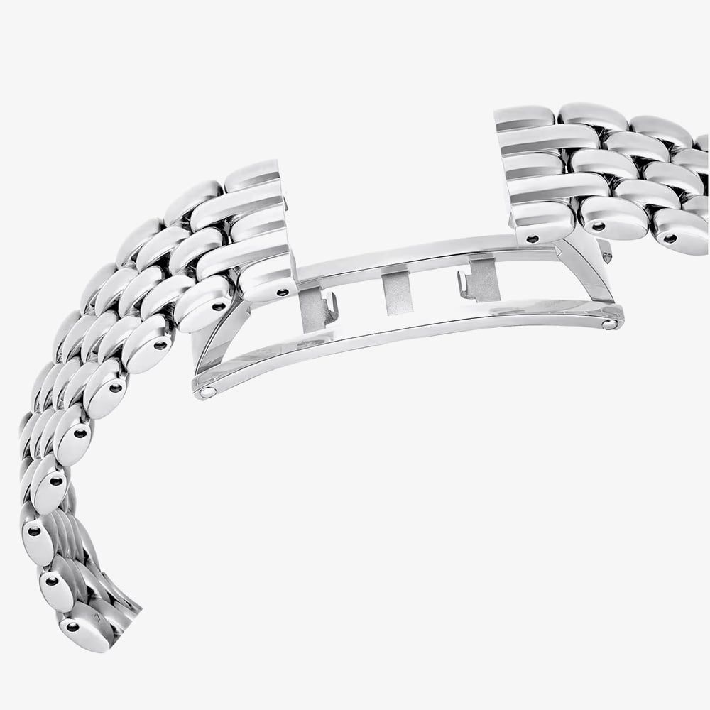 • Presented on a silver stainless steel bracelet .