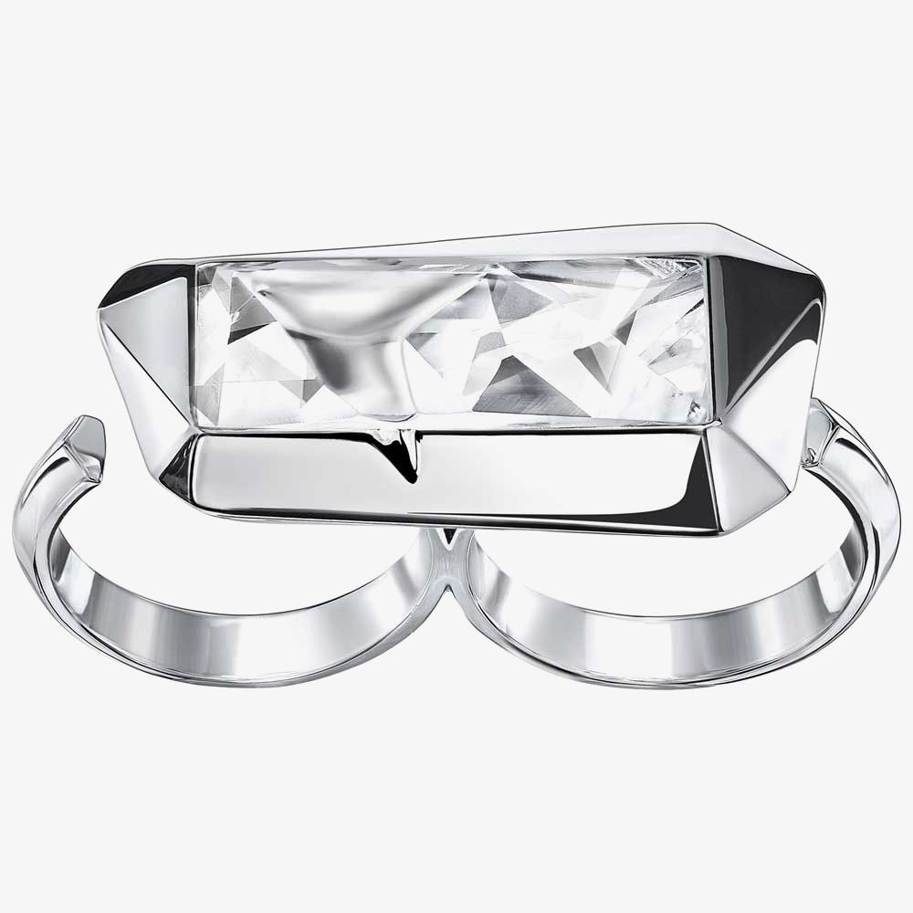 Atelier Swarovski designed by world renowned artist Jean Paul Gaultier features this Reverse double ring. Consisting of a unique, peculiar design that incorporates a Kaputt crystal cut set in sculptured rhodium-plated metal. The perfect stand out statement piece to add to any outfit.