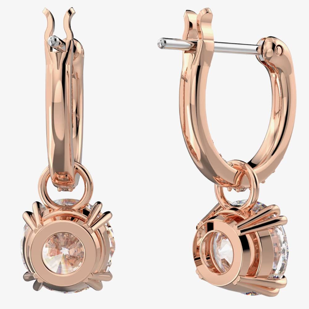 Striking a harmonious balance between dramatic and refined, the dazzling centre stones are accentuated with pavé detailing on the gallery and hoops, adorned with rose gold-tone plating.