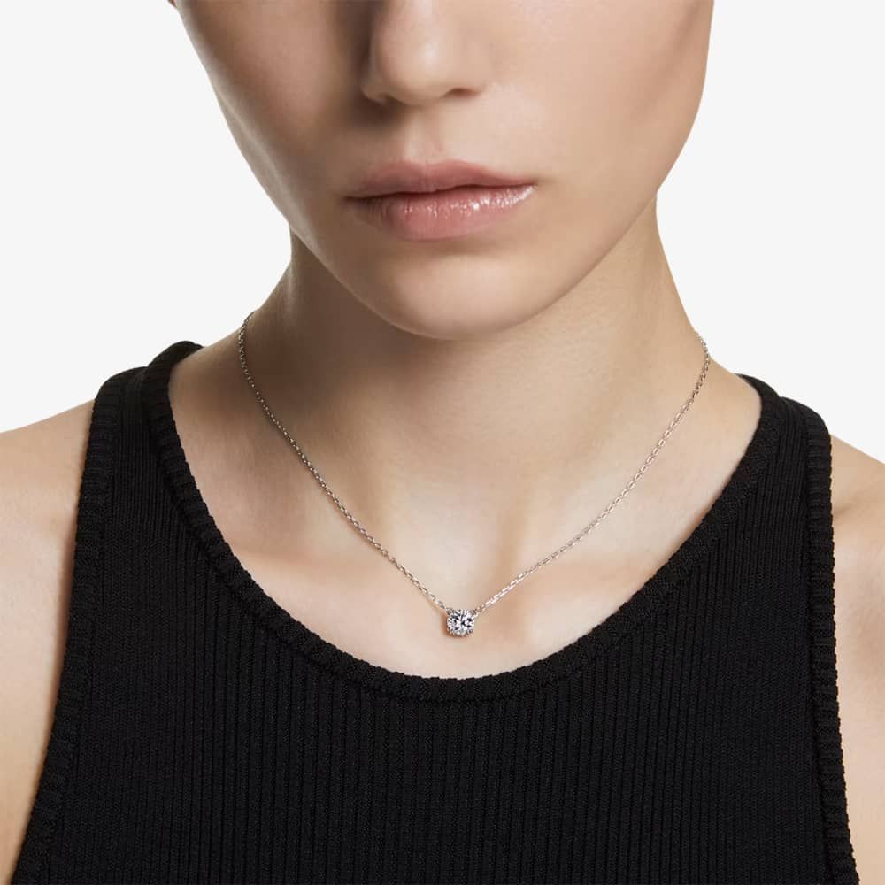 Draped on a rhodium-plated chain, it showcases a stunning center stone surrounded by a brilliant pavé on the side gallery. The pendant is gracefully completed with an elongated design that incorporates a solitary stone at the end.