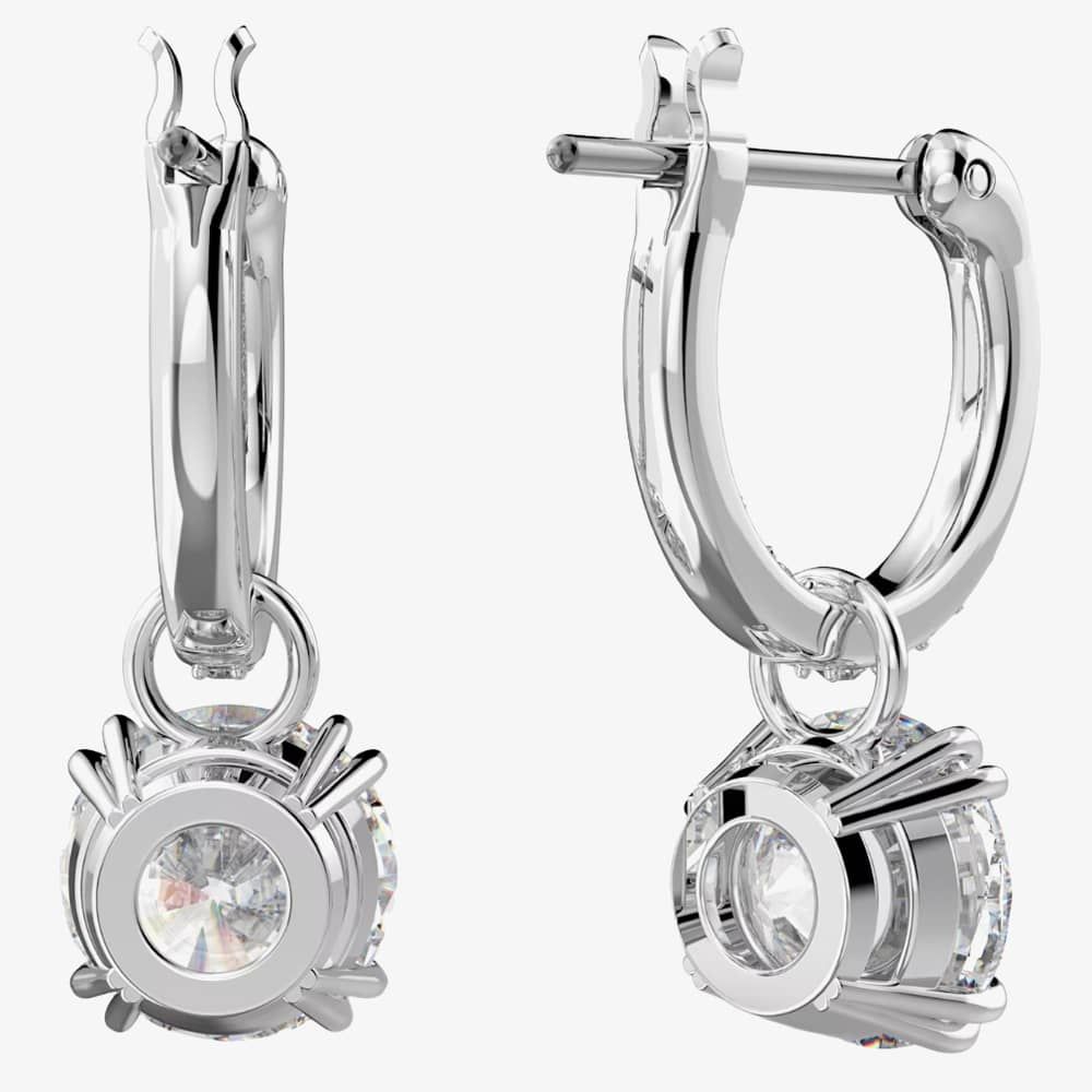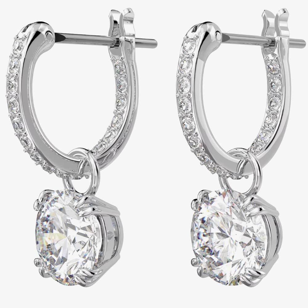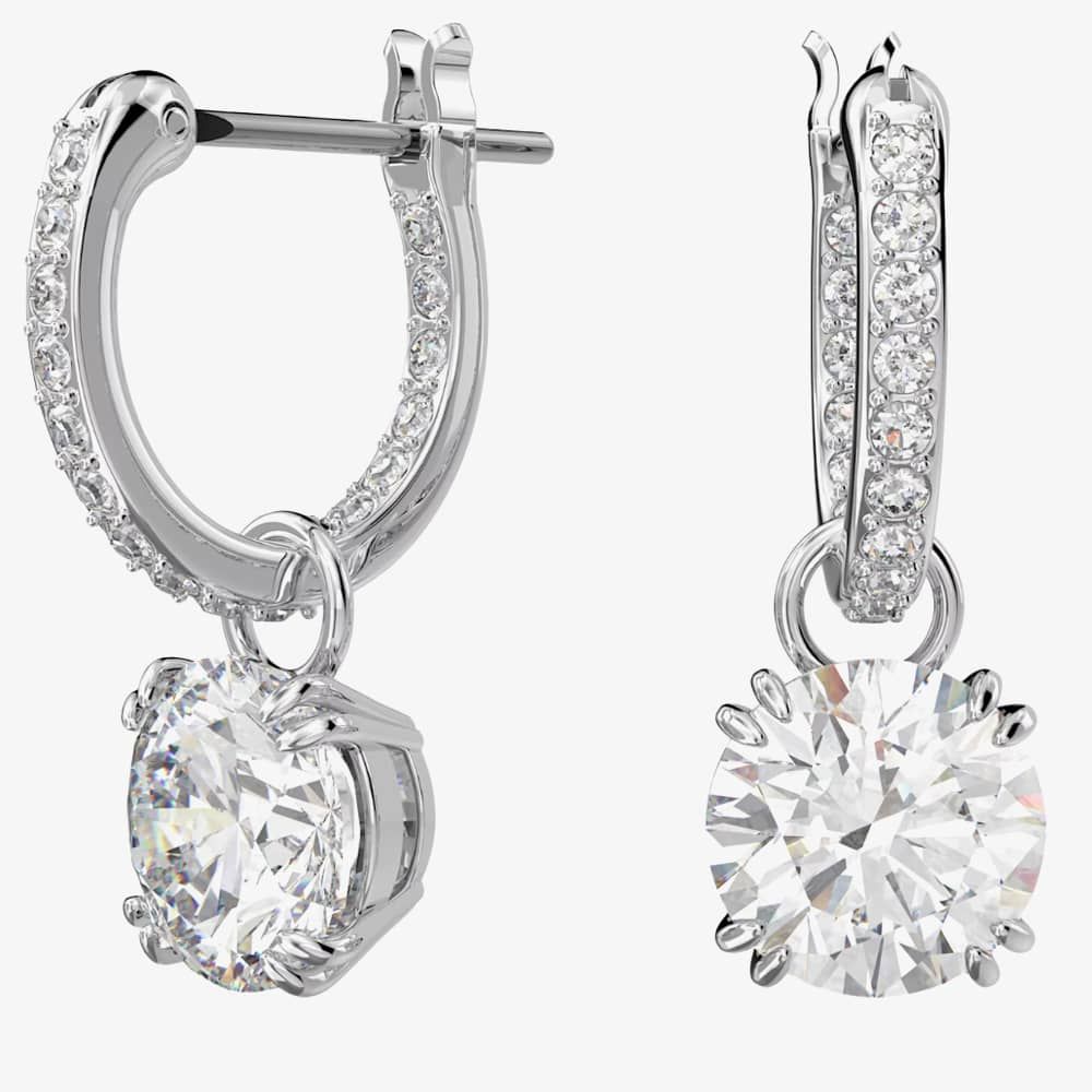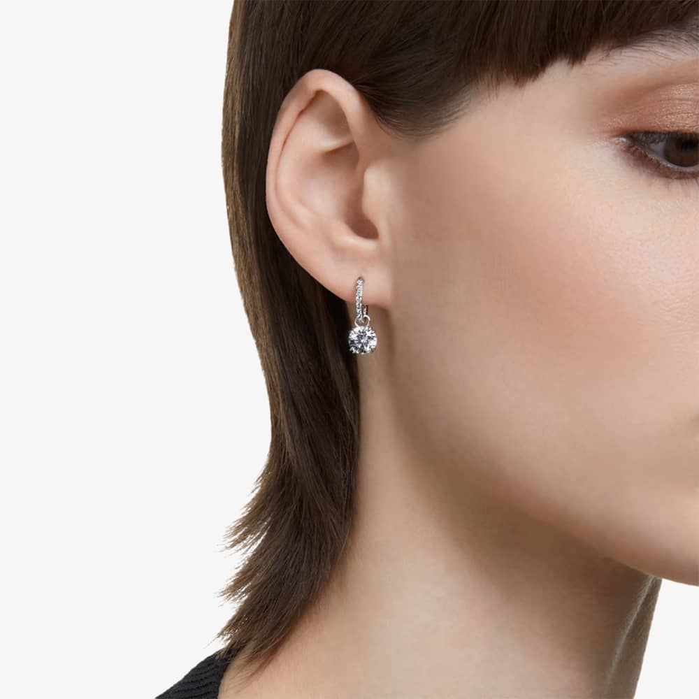 Striking the perfect equilibrium between dramatic and refined, the dazzling centre stones are accentuated by pavé detailing on the gallery and hoops, elegantly set with rhodium plating.