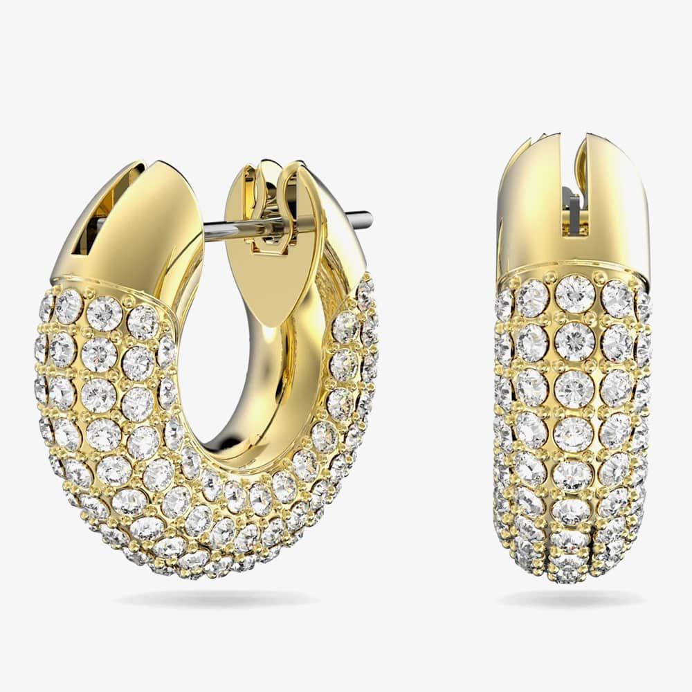 Swarovski Ladies Dextera Gold Plated Pave Hoop Earrings 5636530 are crafted from base metal with gold plating. Its sculptural design celebrates Swarovski's iconic pave technique with sparkling foiled clear crystals, finished off with a subtle post-fastening. These modern classic hoop earrings can be worn in the daytime or as a duo after-dark. Dimensions: Length: 1.5 cm. Width: 1.5 cm.