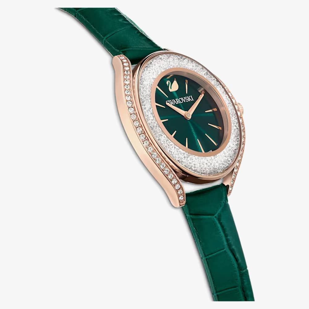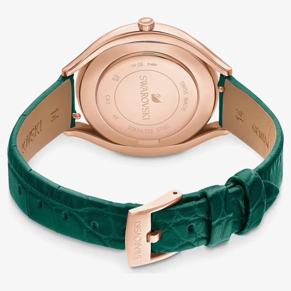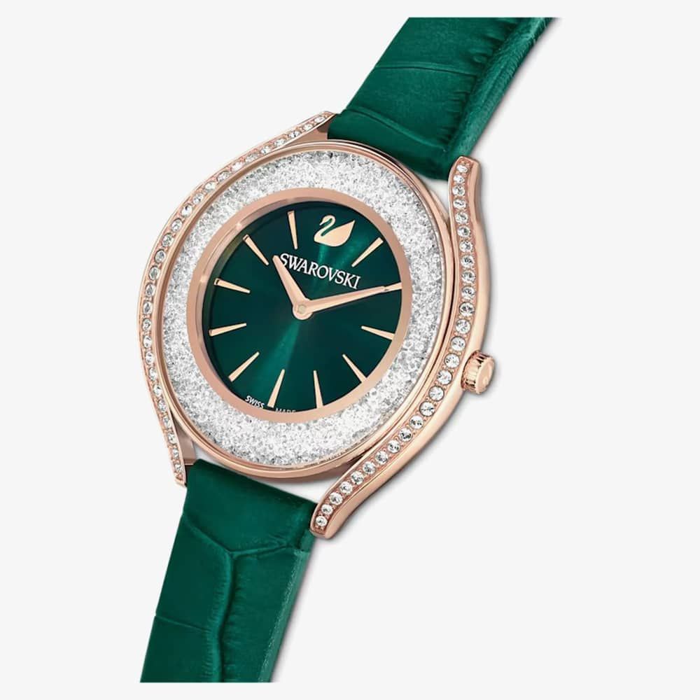 Exude sophistication with the exquisite Crystalline Aura timepiece, crafted in Switzerland. Merging style with utility, it boasts over 1,300 crystals that enhance its rose gold-tone allure, coupled with a water resistance of up to 50 meters. Its lively green dial, marked with the Swarovski swan at 12 o'clock, harmonizes perfectly with the Italian calf-skin leather strap.