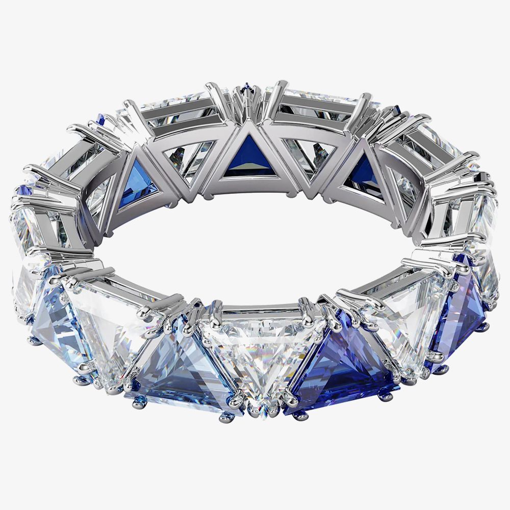 Offering a stunning blend of sophistication and sparkle, the Swarovski Ladies Millenia Blue Cocktail Ring 5608527 is a modern wardrobe essential. With rhodium plating, this cocktail ring from Collection I: Millenia features tessellating triangle-cut clear and blue crystals which create a dazzling effect with hints of prismatic colour. Perfect for wear on its own to add some glitz and glamour, or to stack with other rings for a bigger impact.