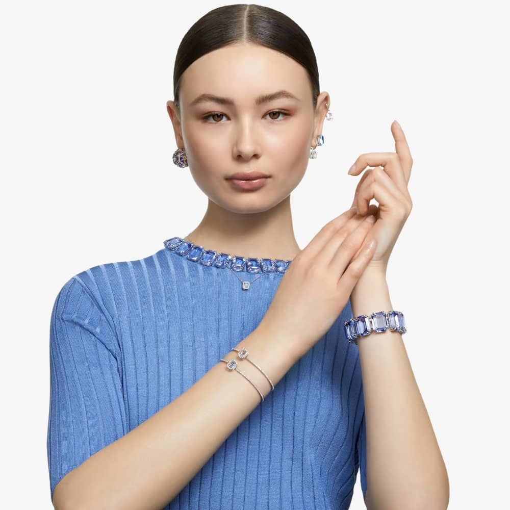 A vibrant blue octagon-cut stone takes center stage, surrounded by smaller clear stones, and elegantly suspended from a sleek rhodium-plated chain. For a personalised touch, layer it with other vibrant styles from the collection to craft your unique and eye-catching color combination. This pendant is a statement piece that effortlessly blends innovation with timeless elegance.