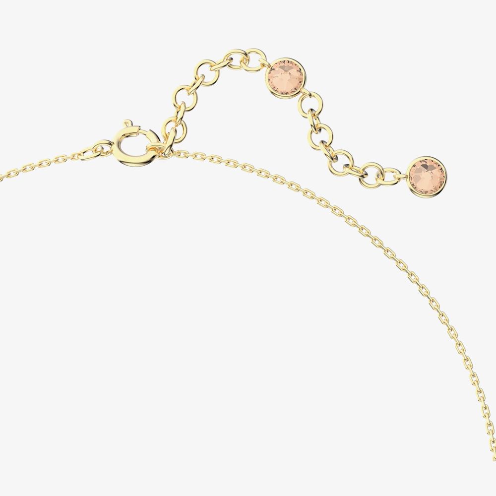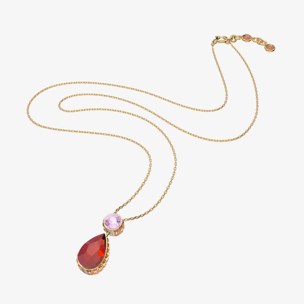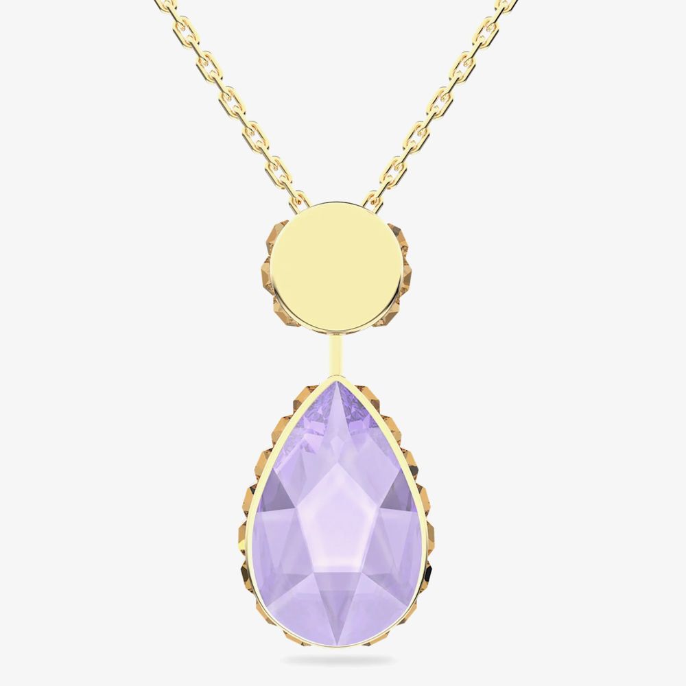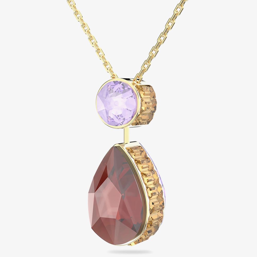 Blending together serene tones of deep green, lilac, and Colorado topaz, this reversible necklace showcases a captivating design. The centerpiece comprises two distinct crystals, an encircled round one and a larger drop-cut crystal that pivots, allowing you to flaunt either side. Suspended from a delicate gold-tone plated chain, this intricately crafted piece makes a striking impression.